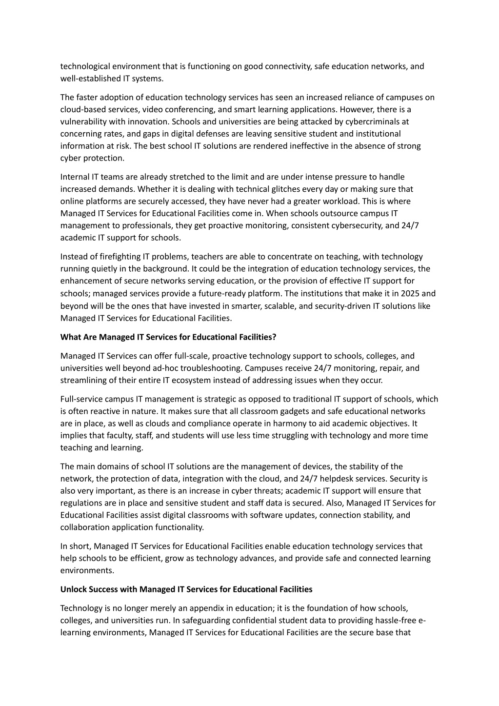 technological environment that is functioning on good connectivity, safe education networks, and well-established IT systems. The faster adoption of education technology services has seen an increased reliance of campuses on cloud-based services, video conferencing, and smart learning applications. However, there is a vulnerability with innovation. Schools and universities are being attacked by cybercriminals at concerning rates, and gaps in digital defenses are leaving sensitive student and institutional information at risk. The best school IT solutions are rendered ineffective in the absence of strong cyber protection. Internal IT teams are already stretched to the limit and are under intense pressure to handle increased demands. Whether it is dealing with technical glitches every day or making sure that online platforms are securely accessed, they have never had a greater workload. This is where Managed IT Services for Educational Facilities come in. When schools outsource campus IT management to professionals, they get proactive monitoring, consistent cybersecurity, and 24/7 academic IT support for schools. Instead of firefighting IT problems, teachers are able to concentrate on teaching, with technology running quietly in the background. It could be the integration of education technology services, the enhancement of secure networks serving education, or the provision of effective IT support for schools; managed services provide a future-ready platform. The institutions that make it in 2025 and beyond will be the ones that have invested in smarter, scalable, and security-driven IT solutions like Managed IT Services for Educational Facilities. What Are Managed IT Services for Educational Facilities? Managed IT Services can offer full-scale, proactive technology support to schools, colleges, and universities well beyond ad-hoc troubleshooting. Campuses receive 24/7 monitoring, repair, and streamlining of their entire IT ecosystem instead of addressing issues when they occur. Full-service campus IT management is strategic as opposed to traditional IT support of schools, which is often reactive in nature. It makes sure that all classroom gadgets and safe educational networks are in place, as well as clouds and compliance operate in harmony to aid academic objectives. It implies that faculty, staff, and students will use less time struggling with technology and more time teaching and learning. The main domains of school IT solutions are the management of devices, the stability of the network, the protection of data, integration with the cloud, and 24/7 helpdesk services. Security is also very important, as there is an increase in cyber threats; academic IT support will ensure that regulations are in place and sensitive student and staff data is secured. Also, Managed IT Services for Educational Facilities assist digital classrooms with software updates, connection stability, and collaboration application functionality. In short, Managed IT Services for Educational Facilities enable education technology services that help schools to be efficient, grow as technology advances, and provide safe and connected learning environments. Unlock Success with Managed IT Services for Educational Facilities Technology is no longer merely an appendix in education; it is the foundation of how schools, colleges, and universities run. In safeguarding confidential student data to providing hassle-free e- learning environments, Managed IT Services for Educational Facilities are the secure base that