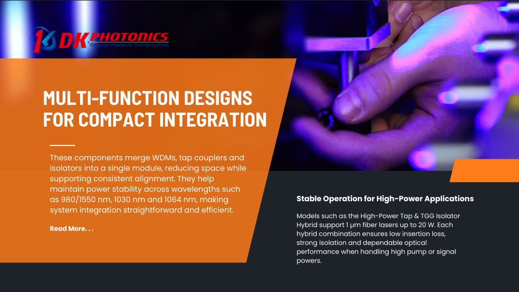 DK Laseru2019s PM Hybrid Components support demanding fiber-laser systems with precise polarization control and compact multifunction designs. These solutions combine WDMs, tap couplers, isolators and filters to keep optical setups efficient and stable across multiple wavelengths used in modern laser applications.