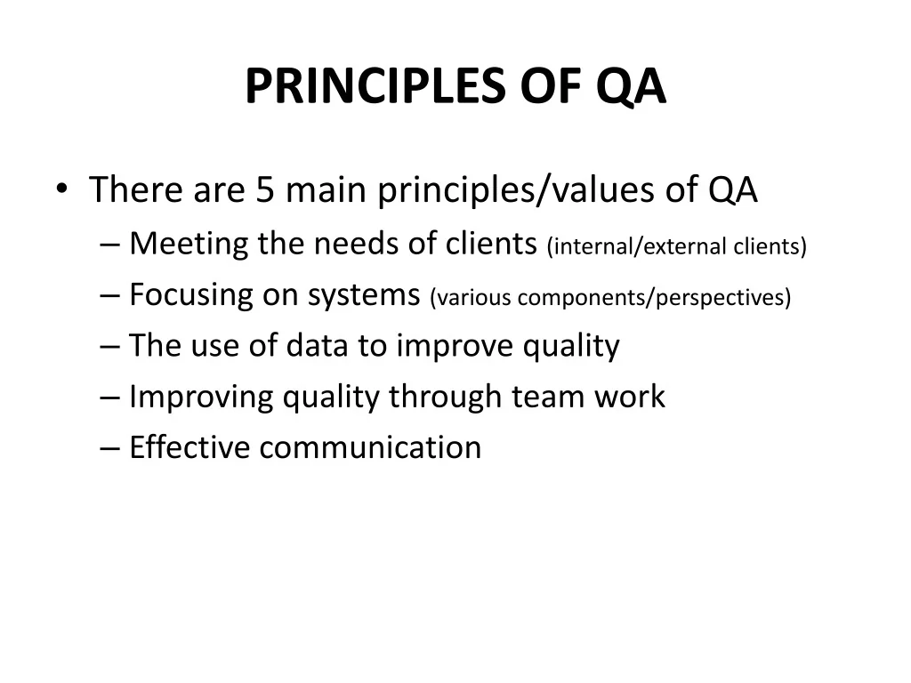 PRINCIPLES OF QA • There are 5 main principles/values of QA • Meeting the needs of clients (internal/external clients) • Focusing on systems (various components/perspectives) • The use of data to improve quality • Improving quality through team work • Effective communication