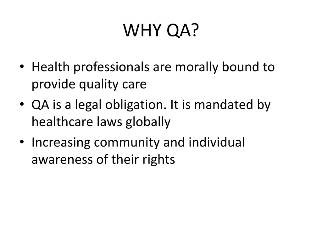 WHY QA? • Health professionals are morally bound to provide quality care • QA is a legal obligation. It is mandated by healthcare laws globally • Increasing community and individual awareness of their rights