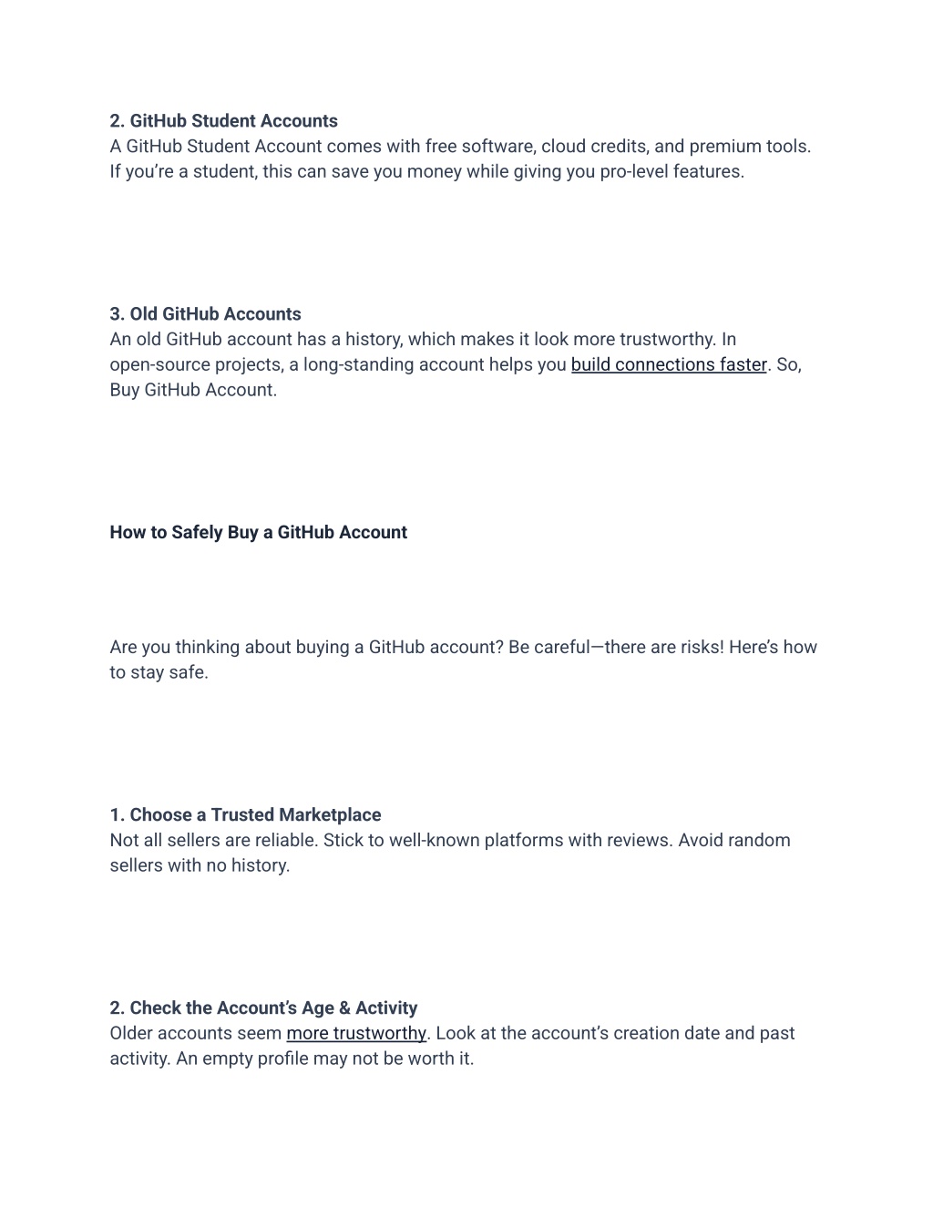 2. GitHub Student Accounts A GitHub Student Account comes with free software, cloud credits, and premium tools. If you’re a student, this can save you money while giving you pro-level features. 3. Old GitHub Accounts An old GitHub account has a history, which makes it look more trustworthy. In open-source projects, a long-standing account helps you build connections faster. So, Buy GitHub Account. How to Safely Buy a GitHub Account Are you thinking about buying a GitHub account? Be careful—there are risks! Here’s how to stay safe. 1. Choose a Trusted Marketplace Not all sellers are reliable. Stick to well-known platforms with reviews. Avoid random sellers with no history. 2. Check the Account’s Age & Activity Older accounts seem more trustworthy. Look at the account’s creation date and past activity. An empty profile may not be worth it.