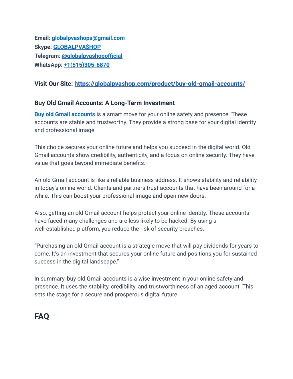 If you face any problem you can contact us. Email: globalpvashops@gmail.com Skype: GLOBALPVA$HOP Telegram: @globalpvashopofficial WhatsApp: +1(515)305-6870 Visit Our Site: https://globalpvashop.com/product/buy-old-gmail-accounts/ Understanding the Risks of a Compromised Email Account Email accounts are key to our online lives. If they get hacked, the damage can be huge. Hackers might get your personal and financial details, risking identity theft and fraud. They could also pretend to be you, hurting your professional reputation and trustworthiness. The Benefits of Using an Aged Gmail Account ● Proven track record of activity and credibility