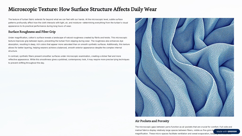 Microscopic Texture: How Surface Structure Affects Daily Wear The texture of turban fabric extends far beyond what we can feel with our hands. At the microscopic level, subtle surface patterns profoundly affect how the cloth interacts with light, air, and moisture—determining everything from the turban's visual appearance to its practical performance during long hours of wear. Surface Roughness and Fiber Grip Under magnification, cotton's surface reveals a landscape of natural roughness created by fibrils and twists. This microscopic texture improves grip between layers, preventing the turban from slipping during wear. The roughness also enhances dye absorption, resulting in deep, rich colors that appear more saturated than on smooth synthetic surfaces. Additionally, this texture allows for better layering, helping wearers achieve a balanced, smooth exterior appearance despite the complex internal structure. In contrast, synthetic fibers present smoother surfaces under microscopic examination, creating a slicker feel and more reflective appearance. While this smoothness gives a polished, contemporary look, it may require more precise tying techniques to prevent shifting throughout the day. Air Pockets and Porosity The microscopic gaps between yarns function as air pockets that are crucial for comfort. Full voile and malmal fabrics display relatively large spaces between fibers, visible as fine grid-like patterns under magnification. These micro-spaces facilitate ventilation and sweat evaporation, keeping the head cool and dry even in hot climates. Rubia's tighter weave reduces these air gaps but compensates with superior strength and structure, making it preferred for cooler regions or ceremonial occasions.