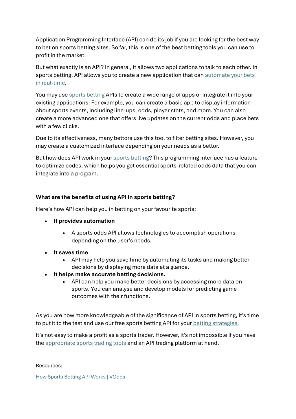 Application Programming Interface (API) can do its job if you are looking for the best way to bet on sports betting sites. So far, this is one of the best betting tools you can use to profit in the market. But what exactly is an API? In general, it allows two applications to talk to each other. In sports betting, API allows you to create a new application that canautomate your bets in real-time. You may usesports bettingAPIs to create a wide range of apps or integrate it into your existing applications. For example, you can create a basic app to display information about sports events, including line-ups, odds, player stats, and more. You can also create a more advanced one that offers live updates on the current odds and place bets with a few clicks. Due to its effectiveness, many bettors use this tool to filter betting sites. However, you may create a customized interface depending on your needs as a bettor. But how does API work in yoursports betting? This programming interface has a feature to optimize codes, which helps you get essential sports-related odds data that you can integrate into a program. What are the benefits of using API in sports betting? Here’s how API can help you in betting on your favourite sports: •It provides automation •A sports odds API allows technologies to accomplish operations depending on the user’s needs. •It saves time •API may help you save time by automating its tasks and making better decisions by displaying more data at a glance. •It helps make accurate betting decisions. •API can help you make better decisions by accessing more data on sports. You can analyse and develop models for predicting game outcomes with their functions. As you are now more knowledgeable of the significance of API in sports betting, it’s time to put it to the test and use our free sports betting API for yourbetting strategies. It’s not easy to make a profit as a sports trader. However, it’s not impossible if you have theappropriate sports trading toolsand an API trading platform at hand. Resources: How Sports Betting API Works | VOdds