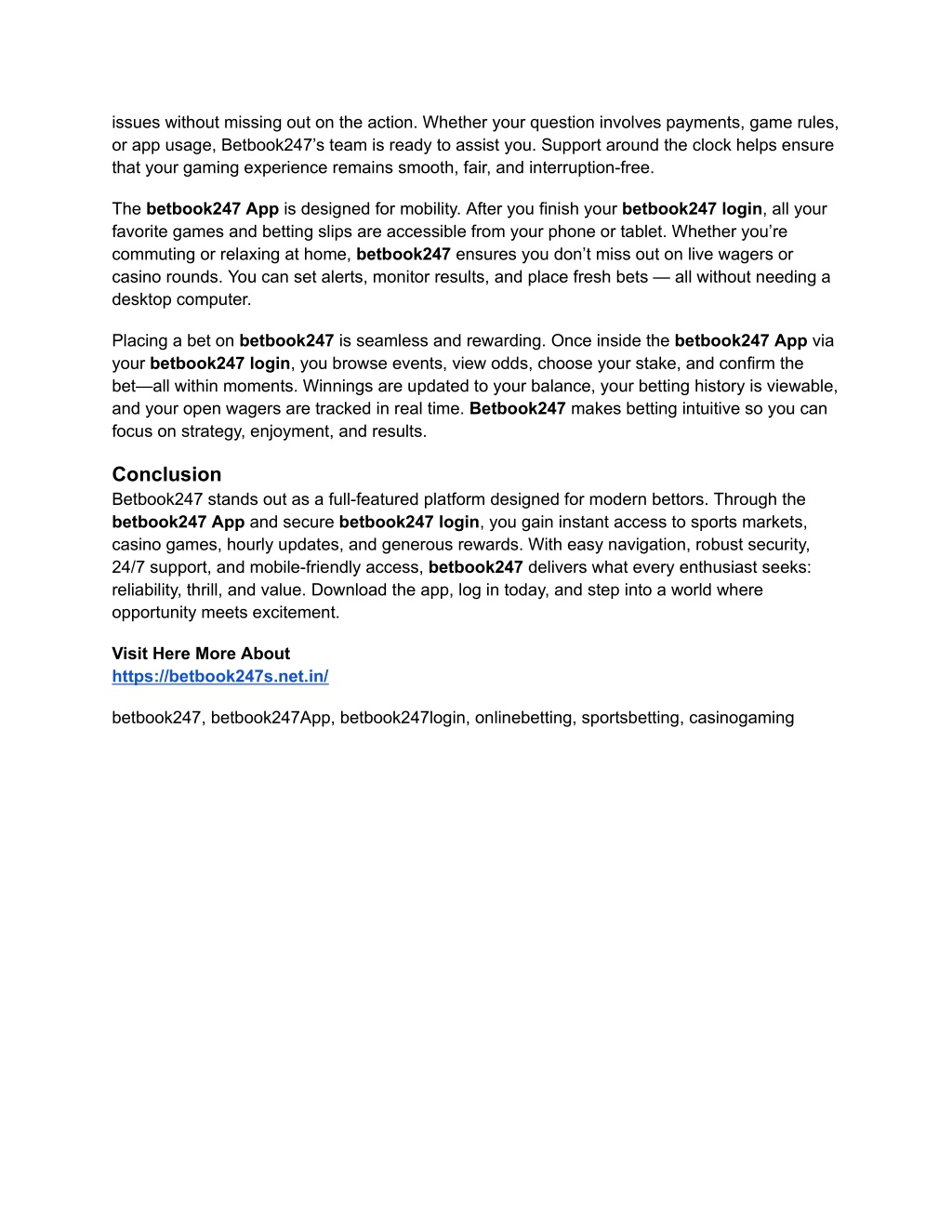 issues without missing out on the action. Whether your question involves payments, game rules, or app usage, Betbook247’s team is ready to assist you. Support around the clock helps ensure that your gaming experience remains smooth, fair, and interruption-free. The betbook247 App is designed for mobility. After you finish your betbook247 login , all your favorite games and betting slips are accessible from your phone or tablet. Whether you’re commuting or relaxing at home, betbook247 ensures you don’t miss out on live wagers or casino rounds. You can set alerts, monitor results, and place fresh bets — all without needing a desktop computer. Placing a bet on betbook247 is seamless and rewarding. Once inside the betbook247 App via your betbook247 login , you browse events, view odds, choose your stake, and confirm the bet—all within moments. Winnings are updated to your balance, your betting history is viewable, and your open wagers are tracked in real time. Betbook247 makes betting intuitive so you can focus on strategy, enjoyment, and results. Conclusion Betbook247 stands out as a full-featured platform designed for modern bettors. Through the betbook247 App and secure betbook247 login , you gain instant access to sports markets, casino games, hourly updates, and generous rewards. With easy navigation, robust security, 24/7 support, and mobile-friendly access, betbook247 delivers what every enthusiast seeks: reliability, thrill, and value. Download the app, log in today, and step into a world where opportunity meets excitement. Visit Here More About https://betbook247s.net.in/ betbook247, betbook247App, betbook247login, onlinebetting, sportsbetting, casinogaming