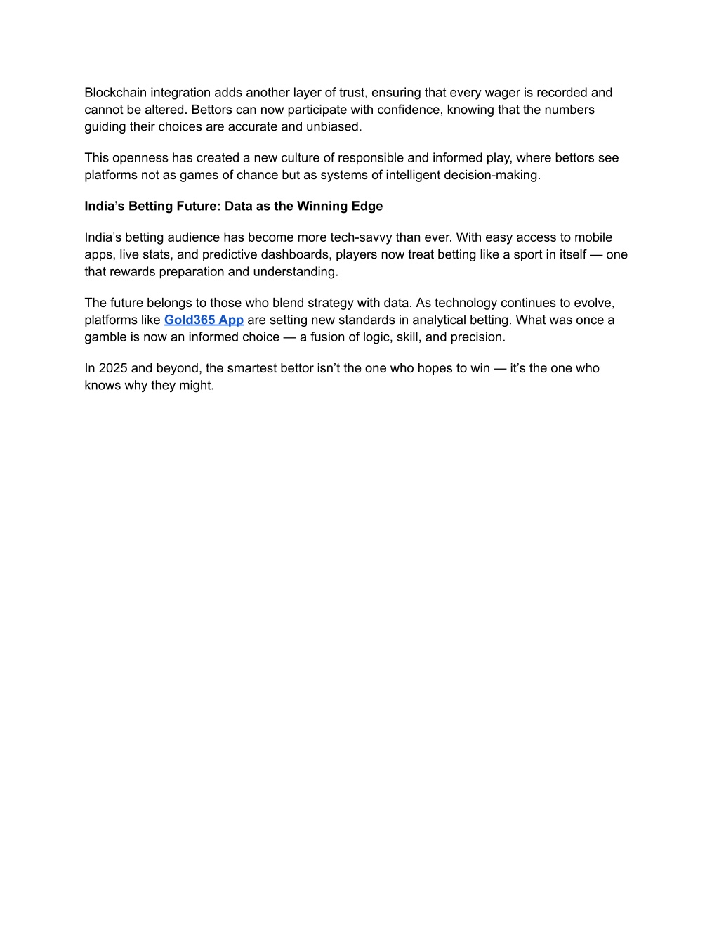 Blockchain integration adds another layer of trust, ensuring that every wager is recorded and cannot be altered. Bettors can now participate with confidence, knowing that the numbers guiding their choices are accurate and unbiased. This openness has created a new culture of responsible and informed play, where bettors see platforms not as games of chance but as systems of intelligent decision-making. India’s Betting Future: Data as the Winning Edge India’s betting audience has become more tech-savvy than ever. With easy access to mobile apps, live stats, and predictive dashboards, players now treat betting like a sport in itself — one that rewards preparation and understanding. The future belongs to those who blend strategy with data. As technology continues to evolve, platforms like Gold365 App are setting new standards in analytical betting. What was once a gamble is now an informed choice — a fusion of logic, skill, and precision. In 2025 and beyond, the smartest bettor isn’t the one who hopes to win — it’s the one who knows why they might.