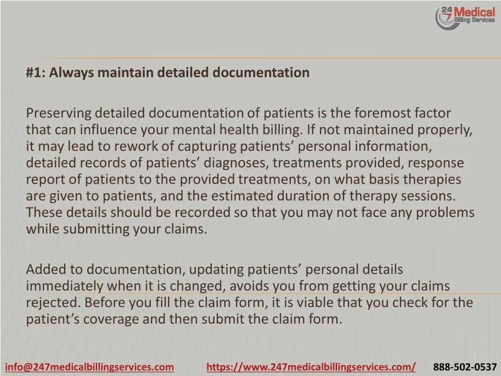 #1: Always maintain detailed documentation Preserving detailed documentation of patients is the foremost factor that can influence your mental health billing. If not maintained properly, it may lead to rework of capturing patients’ personal information, detailed records of patients’ diagnoses, treatments provided, response report of patients to the provided treatments, on what basis therapies are given to patients, and the estimated duration of therapy sessions. These details should be recorded so that you may not face any problems while submitting your claims. Added to documentation, updating patients’ personal details immediately when it is changed, avoids you from getting your claims rejected. Before you fill the claim form, it is viable that you check for the patient’s coverage and then submit the claim form. info@247medicalbillingservices.com https://www.247medicalbillingservices.com/ 888-502-0537