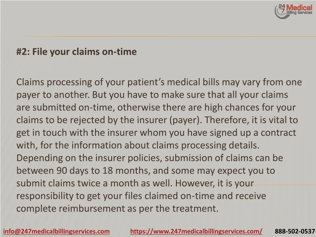 #2: File your claims on-time Claims processing of your patient’s medical bills may vary from one payer to another. But you have to make sure that all your claims are submitted on-time, otherwise there are high chances for your claims to be rejected by the insurer (payer). Therefore, it is vital to get in touch with the insurer whom you have signed up a contract with, for the information about claims processing details. Depending on the insurer policies, submission of claims can be between 90 days to 18 months, and some may expect you to submit claims twice a month as well. However, it is your responsibility to get your files claimed on-time and receive complete reimbursement as per the treatment. info@247medicalbillingservices.com https://www.247medicalbillingservices.com/ 888-502-0537