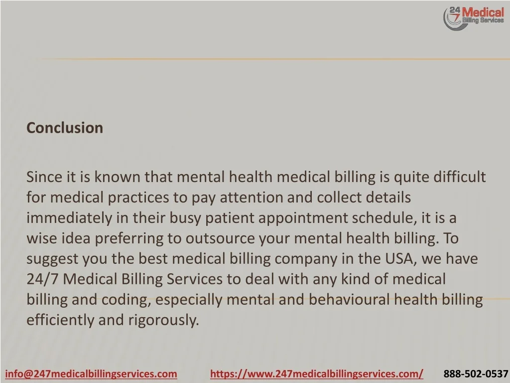 Conclusion Since it is known that mental health medical billing is quite difficult for medical practices to pay attention and collect details immediately in their busy patient appointment schedule, it is a wise idea preferring to outsource your mental health billing. To suggest you the best medical billing company in the USA, we have 24/7 Medical Billing Services to deal with any kind of medical billing and coding, especially mental and behavioural health billing efficiently and rigorously. info@247medicalbillingservices.com https://www.247medicalbillingservices.com/ 888-502-0537