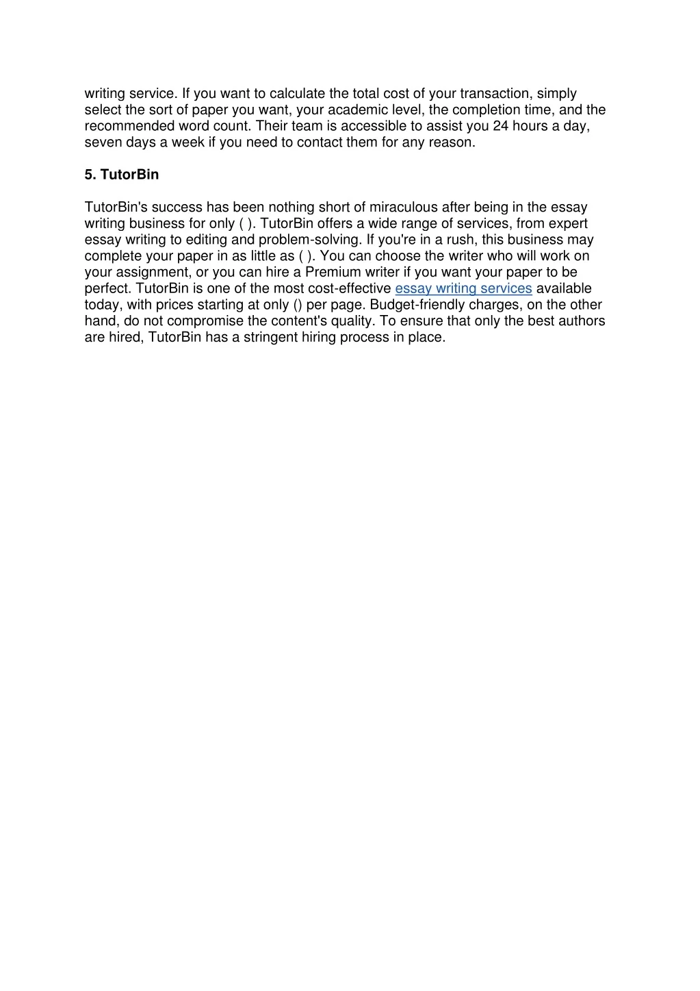 writing service. If you want to calculate the total cost of your transaction, simply select the sort of paper you want, your academic level, the completion time, and the recommended word count. Their team is accessible to assist you 24 hours a day, seven days a week if you need to contact them for any reason. 5. TutorBin TutorBin's success has been nothing short of miraculous after being in the essay writing business for only ( ). TutorBin offers a wide range of services, from expert essay writing to editing and problem-solving. If you're in a rush, this business may complete your paper in as little as ( ). You can choose the writer who will work on your assignment, or you can hire a Premium writer if you want your paper to be perfect. TutorBin is one of the most cost-effective essay writing services available today, with prices starting at only () per page. Budget-friendly charges, on the other hand, do not compromise the content's quality. To ensure that only the best authors are hired, TutorBin has a stringent hiring process in place.