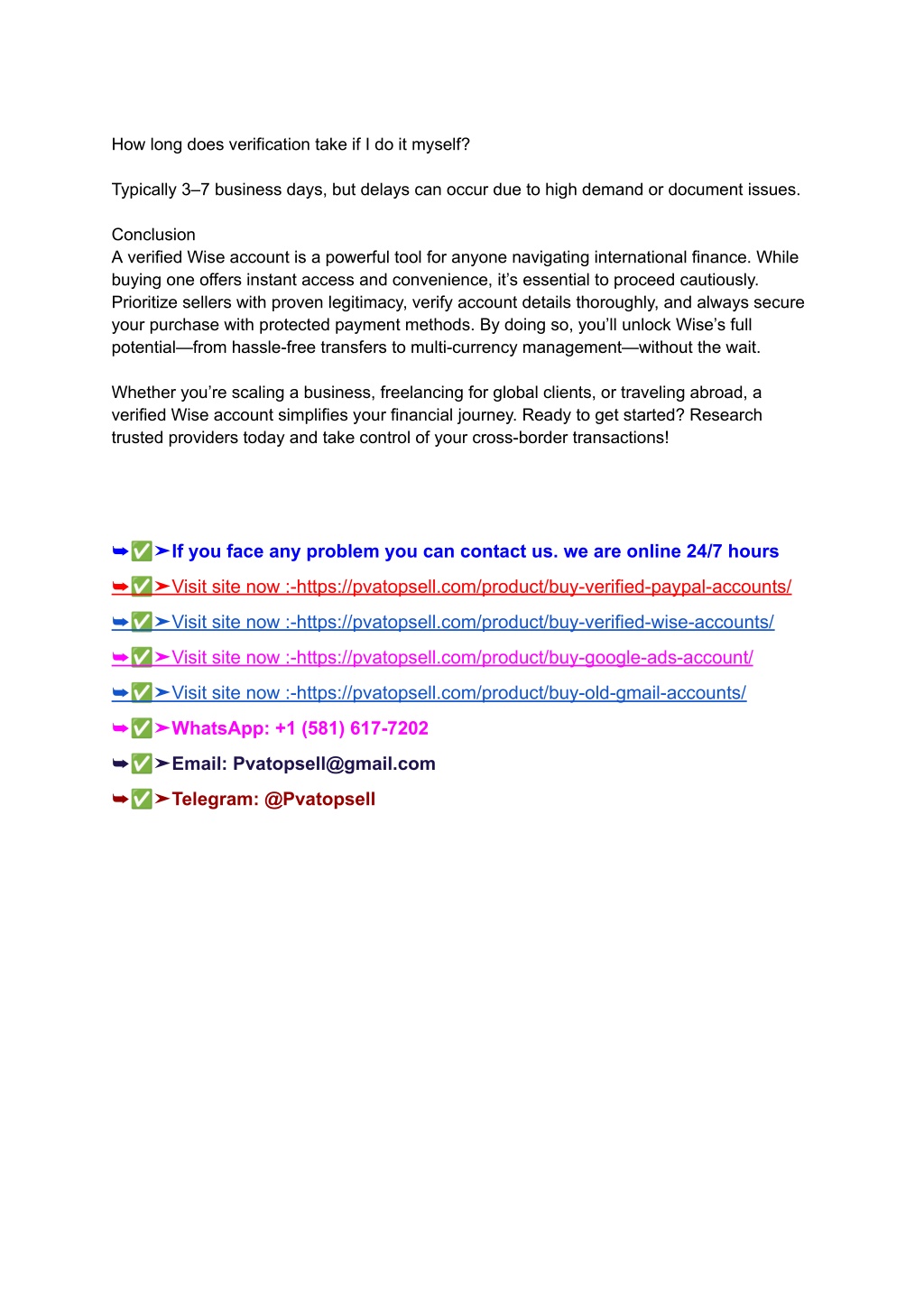 How long does verification take if I do it myself? Typically 3–7 business days, but delays can occur due to high demand or document issues. Conclusion A verified Wise account is a powerful tool for anyone navigating international finance. While buying one offers instant access and convenience, it’s essential to proceed cautiously. Prioritize sellers with proven legitimacy, verify account details thoroughly, and always secure your purchase with protected payment methods. By doing so, you’ll unlock Wise’s full potential—from hassle-free transfers to multi-currency management—without the wait. Whether you’re scaling a business, freelancing for global clients, or traveling abroad, a verified Wise account simplifies your financial journey. Ready to get started? Research trusted providers today and take control of your cross-border transactions! ➥✅➤If you face any problem you can contact us. we are online 24/7 hours ➥✅➤Visit site now :-https://pvatopsell.com/product/buy-verified-paypal-accounts/ ➥✅➤Visit site now :-https://pvatopsell.com/product/buy-verified-wise-accounts/ ➥✅➤Visit site now :-https://pvatopsell.com/product/buy-google-ads-account/ ➥✅➤Visit site now :-https://pvatopsell.com/product/buy-old-gmail-accounts/ ➥✅➤WhatsApp: +1 (581) 617-7202 ➥✅➤Email: Pvatopsell@gmail.com ➥✅➤Telegram: @Pvatopsell