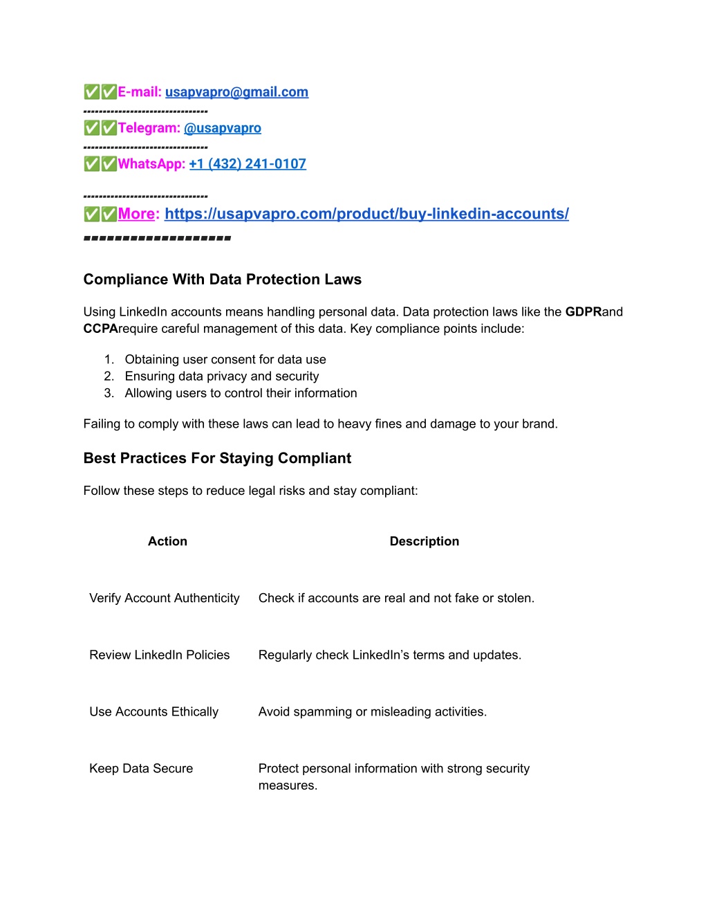 ✅✅E-mail:usapvapro@gmail.com ▰▰▰▰▰▰▰▰▰▰▰▰▰▰▰▰▰▰▰▰▰▰▰▰▰▰▰▰▰▰▰▰ ✅✅Telegram:@usapvapro ▰▰▰▰▰▰▰▰▰▰▰▰▰▰▰▰▰▰▰▰▰▰▰▰▰▰▰▰▰▰▰▰ ✅✅WhatsApp:+1 (432) 241-0107 ▰▰▰▰▰▰▰▰▰▰▰▰▰▰▰▰▰▰▰▰▰▰▰▰▰▰▰▰▰▰▰▰ ✅✅More: https://usapvapro.com/product/buy-linkedin-accounts/ ▰▰▰▰▰▰▰▰▰▰▰▰▰▰▰▰▰▰▰ Compliance With Data Protection Laws Using LinkedIn accounts means handling personal data. Data protection laws like the GDPRand CCPArequire careful management of this data. Key compliance points include: 1. Obtaining user consent for data use 2. Ensuring data privacy and security 3. Allowing users to control their information Failing to comply with these laws can lead to heavy fines and damage to your brand. Best Practices For Staying Compliant Follow these steps to reduce legal risks and stay compliant: Action Description Verify Account Authenticity Check if accounts are real and not fake or stolen. Review LinkedIn Policies Regularly check LinkedIn’s terms and updates. Use Accounts Ethically Avoid spamming or misleading activities. Keep Data Secure Protect personal information with strong security measures.