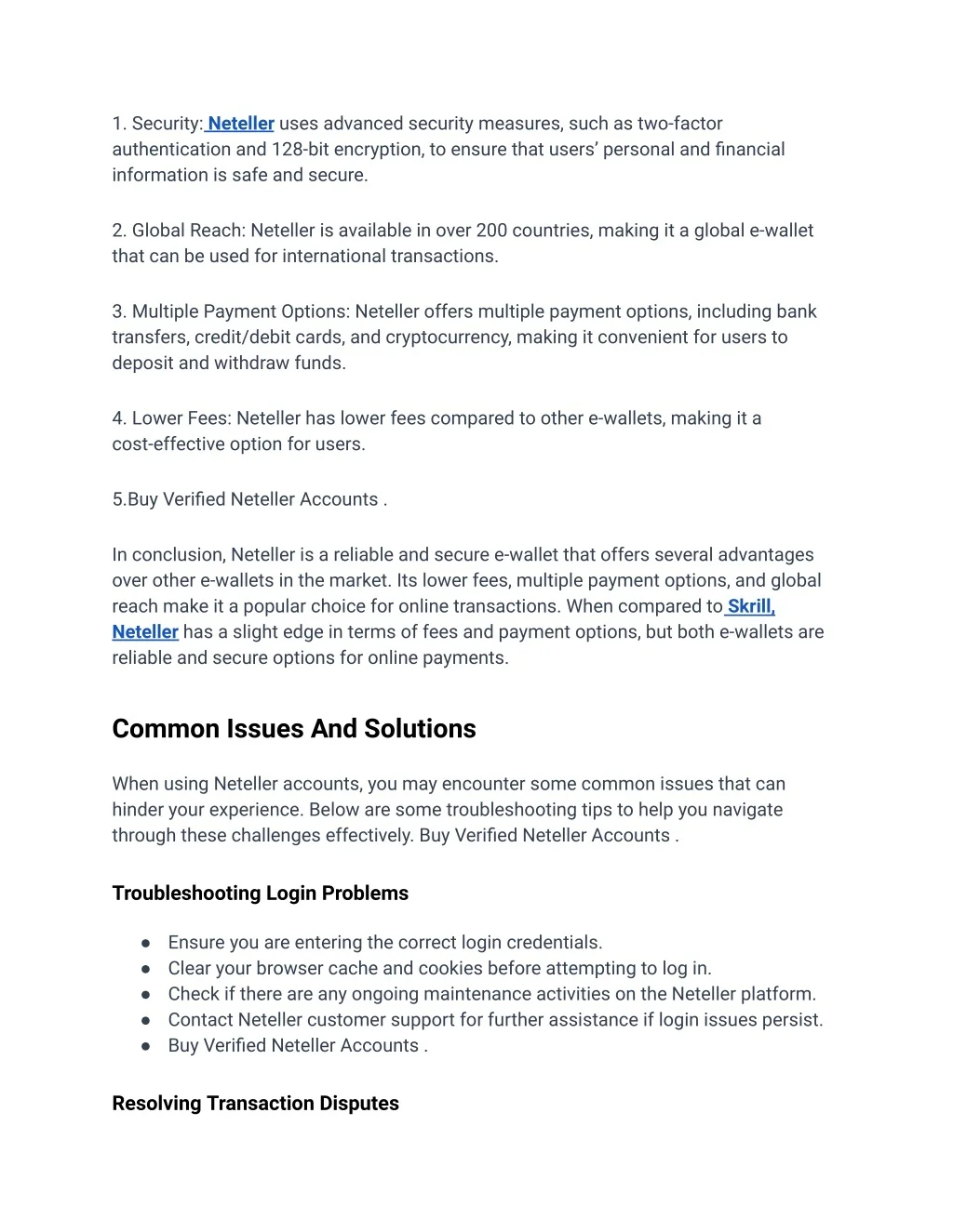 1. Security: Neteller uses advanced security measures, such as two-factor authentication and 128-bit encryption, to ensure that users’ personal and financial information is safe and secure. 2. Global Reach: Neteller is available in over 200 countries, making it a global e-wallet that can be used for international transactions. 3. Multiple Payment Options: Neteller offers multiple payment options, including bank transfers, credit/debit cards, and cryptocurrency, making it convenient for users to deposit and withdraw funds. 4. Lower Fees: Neteller has lower fees compared to other e-wallets, making it a cost-effective option for users. 5.Buy Verified Neteller Accounts . In conclusion, Neteller is a reliable and secure e-wallet that offers several advantages over other e-wallets in the market. Its lower fees, multiple payment options, and global reach make it a popular choice for online transactions. When compared to Skrill, Neteller has a slight edge in terms of fees and payment options, but both e-wallets are reliable and secure options for online payments. Common Issues And Solutions When using Neteller accounts, you may encounter some common issues that can hinder your experience. Below are some troubleshooting tips to help you navigate through these challenges effectively. Buy Verified Neteller Accounts . Troubleshooting Login Problems ● Ensure you are entering the correct login credentials. ● Clear your browser cache and cookies before attempting to log in. ● Check if there are any ongoing maintenance activities on the Neteller platform. ● Contact Neteller customer support for further assistance if login issues persist. ● Buy Verified Neteller Accounts . Resolving Transaction Disputes