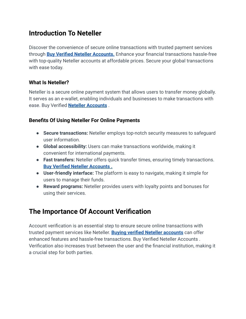 Introduction To Neteller Discover the convenience of secure online transactions with trusted payment services through Buy Verified Neteller Accounts. Enhance your financial transactions hassle-free with top-quality Neteller accounts at affordable prices. Secure your global transactions with ease today. What Is Neteller? Neteller is a secure online payment system that allows users to transfer money globally. It serves as an e-wallet, enabling individuals and businesses to make transactions with ease. Buy Verified Neteller Accounts . Benefits Of Using Neteller For Online Payments ● Secure transactions: Neteller employs top-notch security measures to safeguard user information. ● Global accessibility: Users can make transactions worldwide, making it convenient for international payments. ● Fast transfers: Neteller offers quick transfer times, ensuring timely transactions. Buy Verified Neteller Accounts . ● User-friendly interface: The platform is easy to navigate, making it simple for users to manage their funds. ● Reward programs: Neteller provides users with loyalty points and bonuses for using their services. The Importance Of Account Verification Account verification is an essential step to ensure secure online transactions with trusted payment services like Neteller. Buying verified Neteller accounts can offer enhanced features and hassle-free transactions. Buy Verified Neteller Accounts . Verification also increases trust between the user and the financial institution, making it a crucial step for both parties.