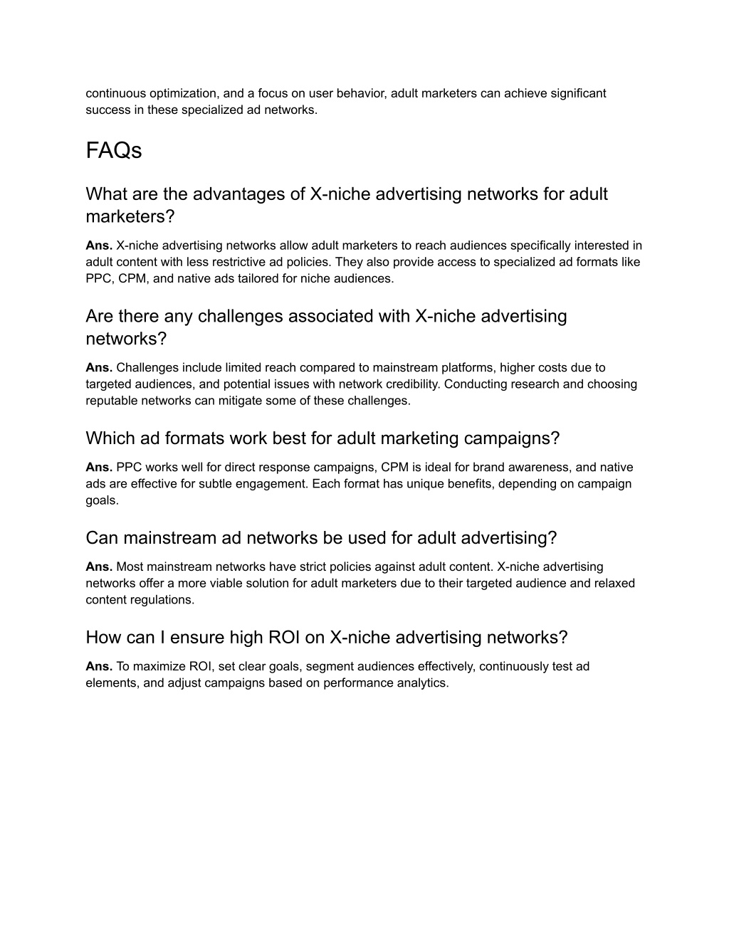 continuous optimization, and a focus on user behavior, adult marketers can achieve significant success in these specialized ad networks. FAQs What are the advantages of X-niche advertising networks for adult marketers? Ans. X-niche advertising networks allow adult marketers to reach audiences specifically interested in adult content with less restrictive ad policies. They also provide access to specialized ad formats like PPC, CPM, and native ads tailored for niche audiences. Are there any challenges associated with X-niche advertising networks? Ans. Challenges include limited reach compared to mainstream platforms, higher costs due to targeted audiences, and potential issues with network credibility. Conducting research and choosing reputable networks can mitigate some of these challenges. Which ad formats work best for adult marketing campaigns? Ans. PPC works well for direct response campaigns, CPM is ideal for brand awareness, and native ads are effective for subtle engagement. Each format has unique benefits, depending on campaign goals. Can mainstream ad networks be used for adult advertising? Ans. Most mainstream networks have strict policies against adult content. X-niche advertising networks offer a more viable solution for adult marketers due to their targeted audience and relaxed content regulations. How can I ensure high ROI on X-niche advertising networks? Ans. To maximize ROI, set clear goals, segment audiences effectively, continuously test ad elements, and adjust campaigns based on performance analytics.