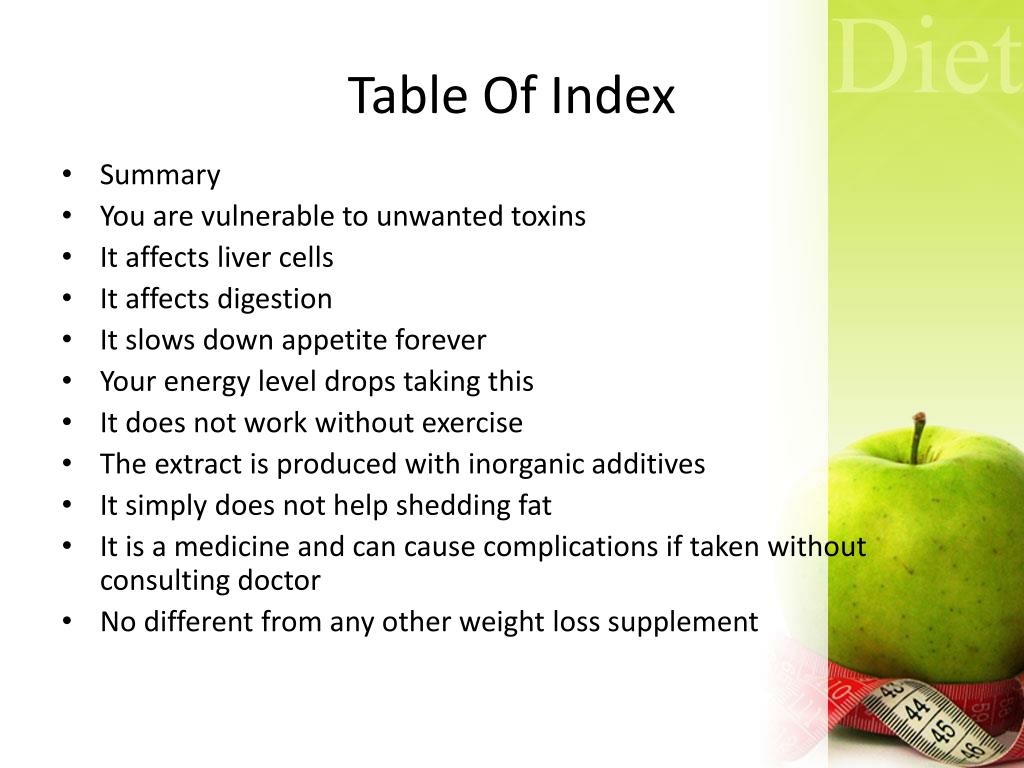 Table Of Index • Summary • You are vulnerable to unwanted toxins • It affects liver cells • It affects digestion • It slows down appetite forever • Your energy level drops taking this • It does not work without exercise • The extract is produced with inorganic additives • It simply does not help shedding fat • It is a medicine and can cause complications if taken without consulting doctor • No different from any other weight loss supplement