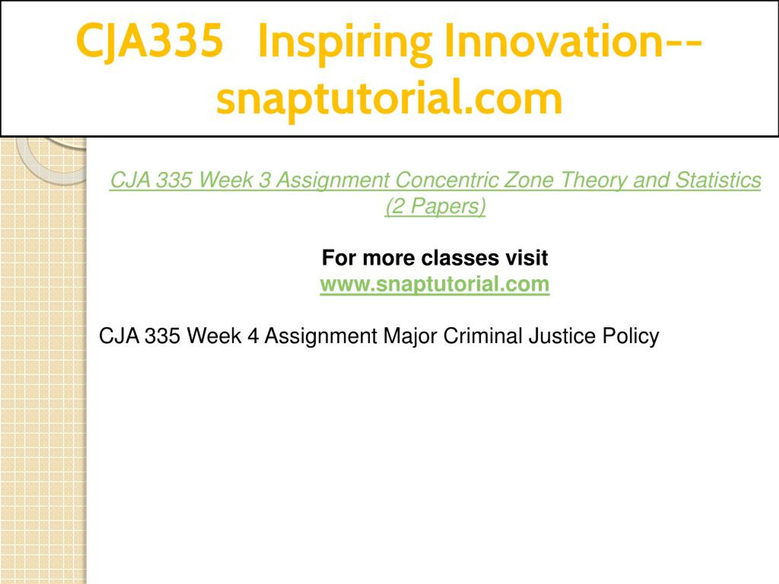CJA335 Inspiring Innovation--snaptutorial.com CJA 335 Week 3 Assignment Concentric Zone Theory and Statistics (2 Papers) For more classes visit www.snaptutorial.com CJA 335 Week 4 Assignment Major Criminal Justice Policy
