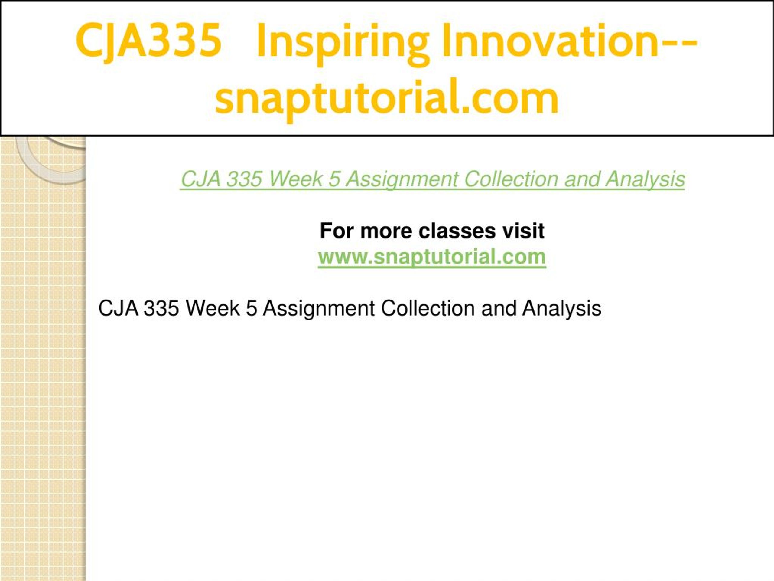 CJA335 Inspiring Innovation--snaptutorial.com CJA 335 Week 5 Assignment Collection and Analysis For more classes visit www.snaptutorial.com CJA 335 Week 5 Assignment Collection and Analysis