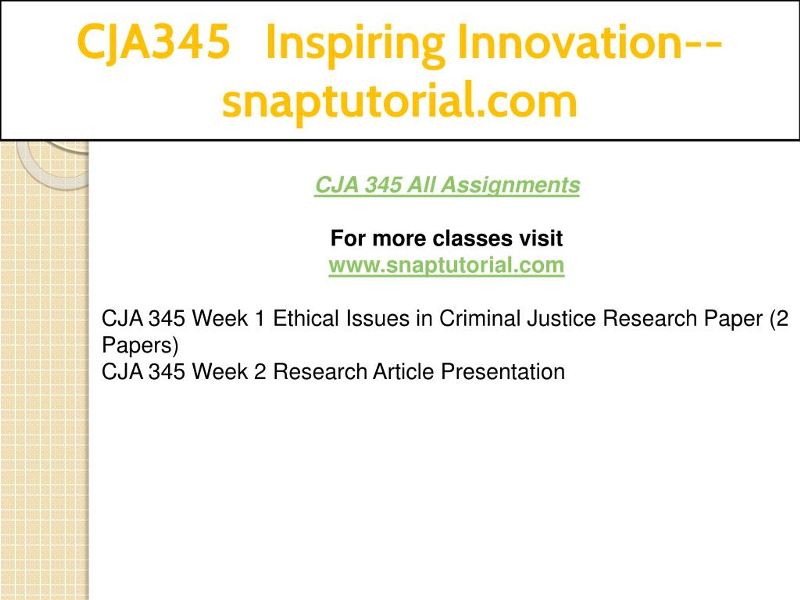 CJA345 Inspiring Innovation--snaptutorial.com CJA 345 Week 1 Ethical Issues in Criminal Justice Research Paper (2 Papers) For more classes visit www.snaptutorial.com This Tutorial contains 2 Papers CJA 345 Week 1 Ethical Issues in Criminal Justice Research Paper