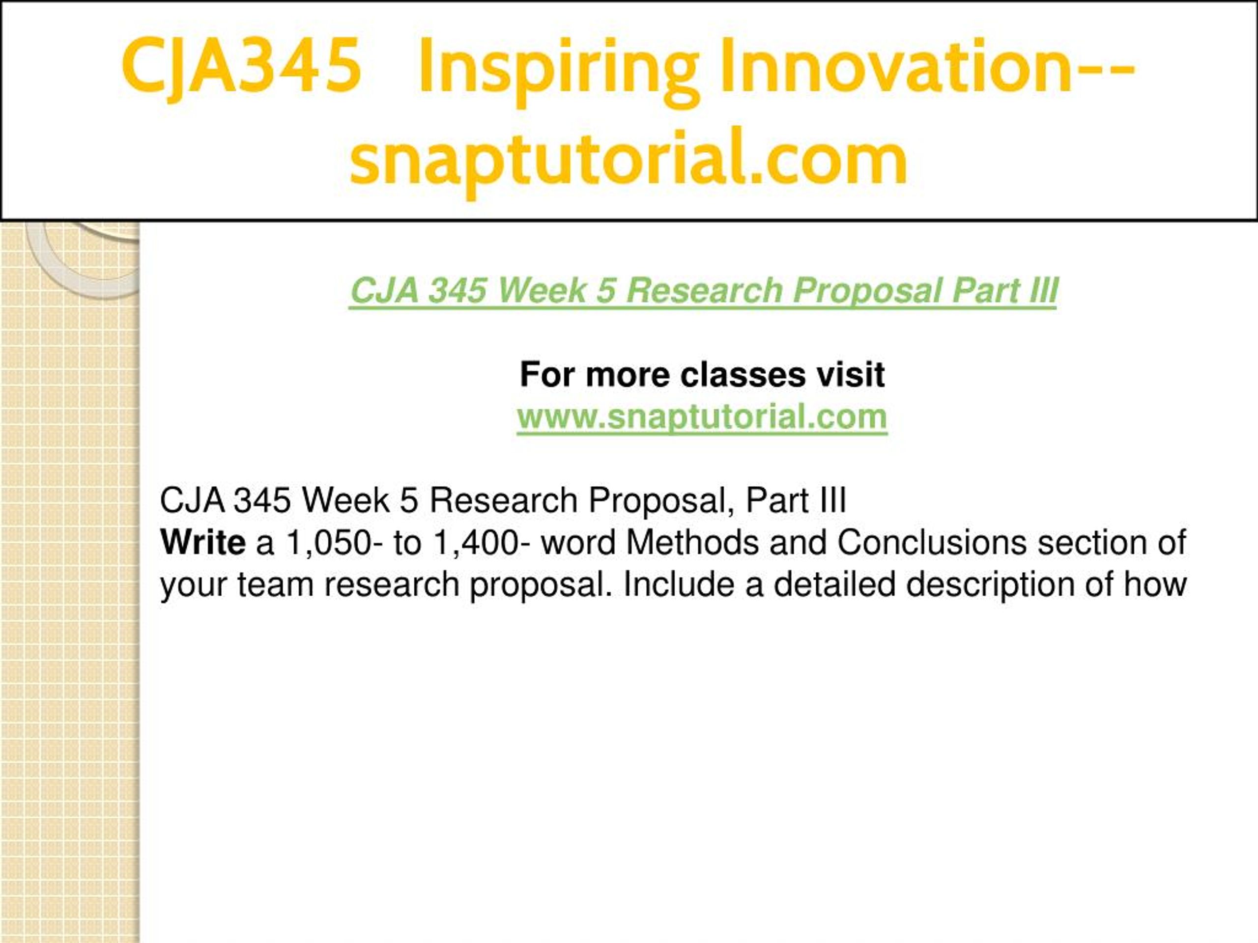 CJA345 Inspiring Innovation--snaptutorial.com CJA 345 Week 5 Research Proposal Part III For more classes visit www.snaptutorial.com CJA 345 Week 5 Research Proposal, Part III Write a 1,050- to 1,400- word Methods and Conclusions section of your team research proposal. Include a detailed description of how