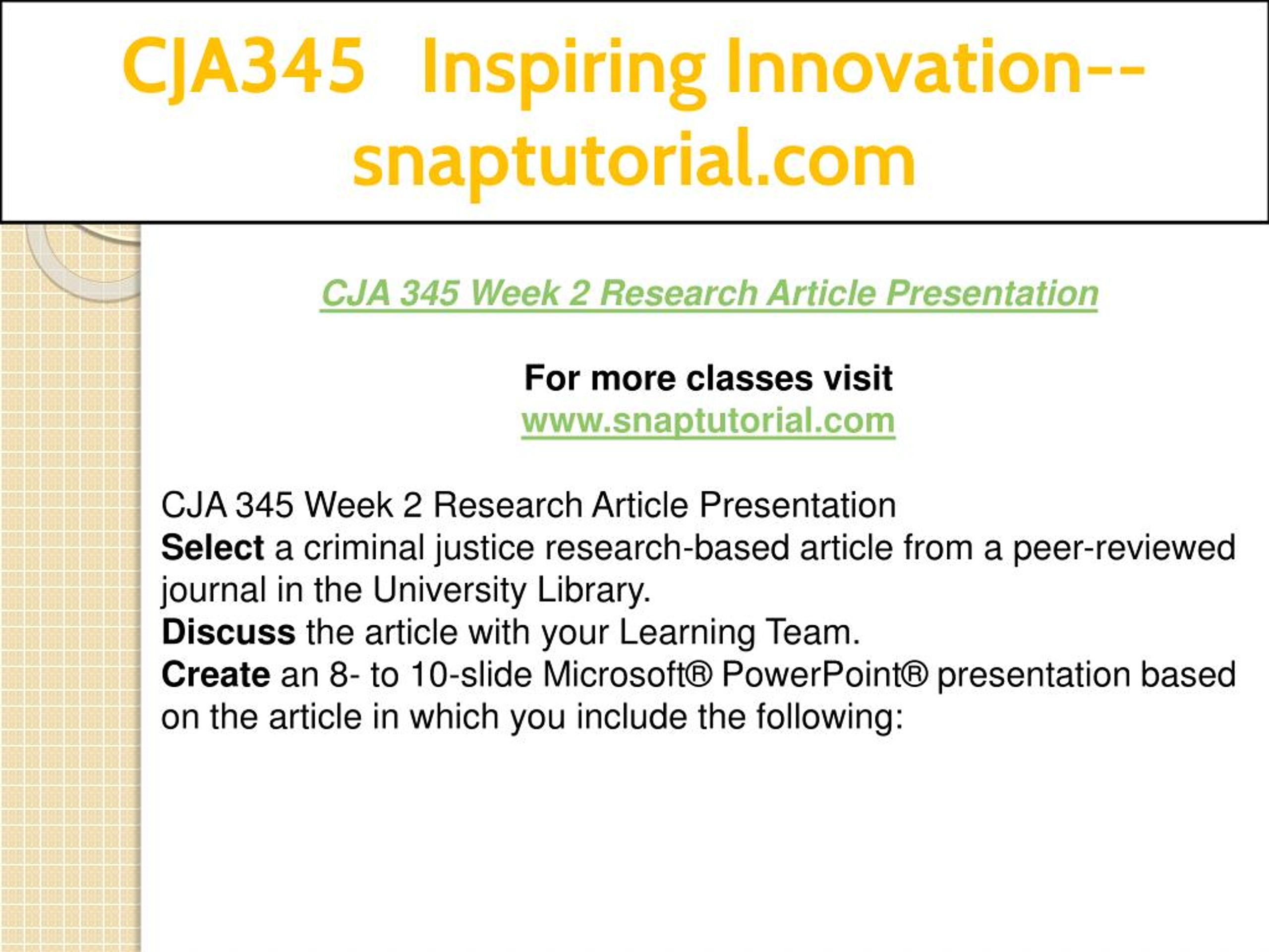CJA345 Inspiring Innovation--snaptutorial.com CJA 345 Week 2 Research Article Presentation For more classes visit www.snaptutorial.com CJA 345 Week 2 Research Article Presentation Select a criminal justice research-based article from a peer-reviewed journal in the University Library. Discuss the article with your Learning Team. Create an 8- to 10-slide Microsoft® PowerPoint® presentation based on the article in which you include the following: