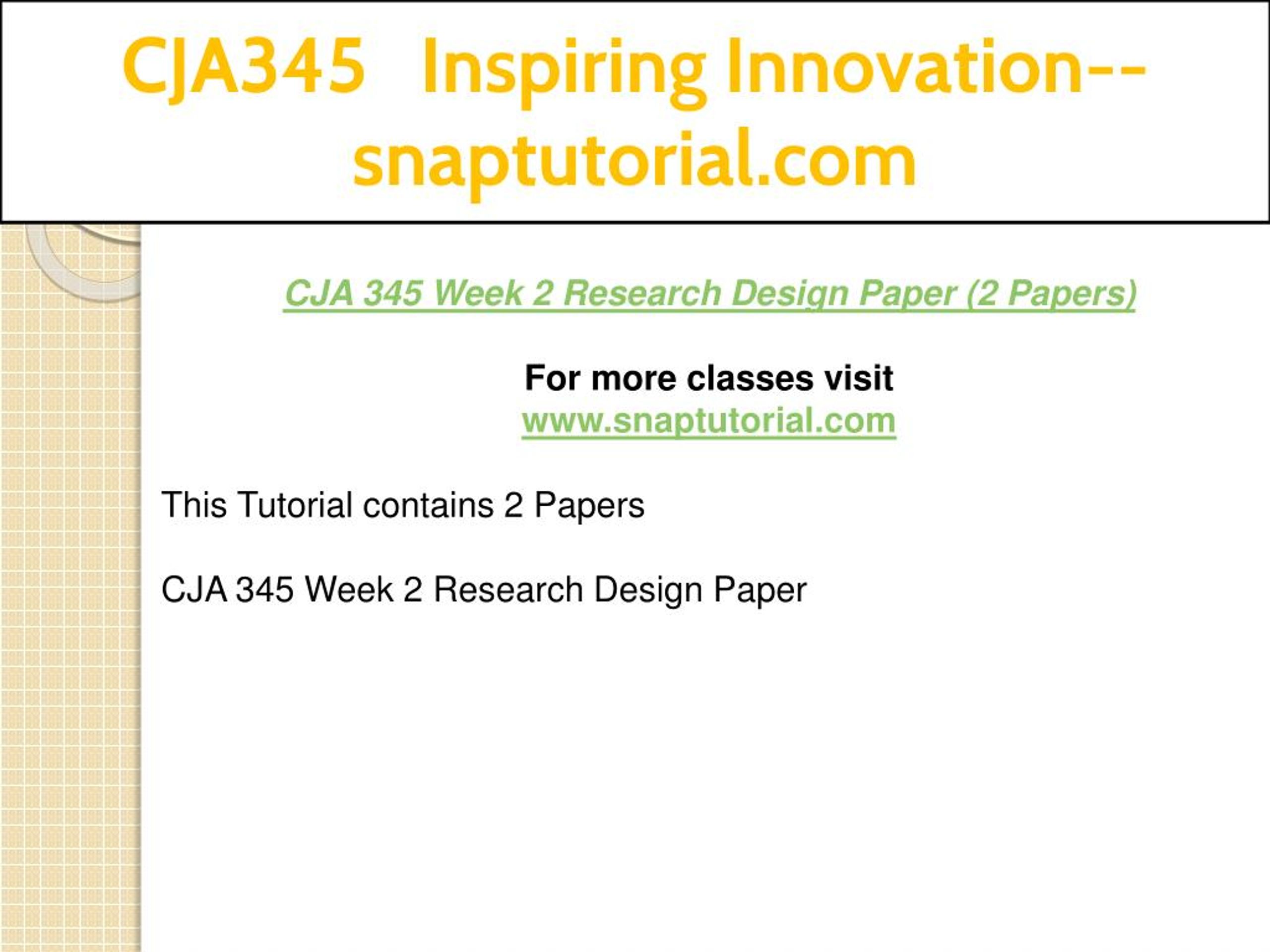 CJA345 Inspiring Innovation--snaptutorial.com CJA 345 Week 2 Research Design Paper (2 Papers) For more classes visit www.snaptutorial.com This Tutorial contains 2 Papers CJA 345 Week 2 Research Design Paper