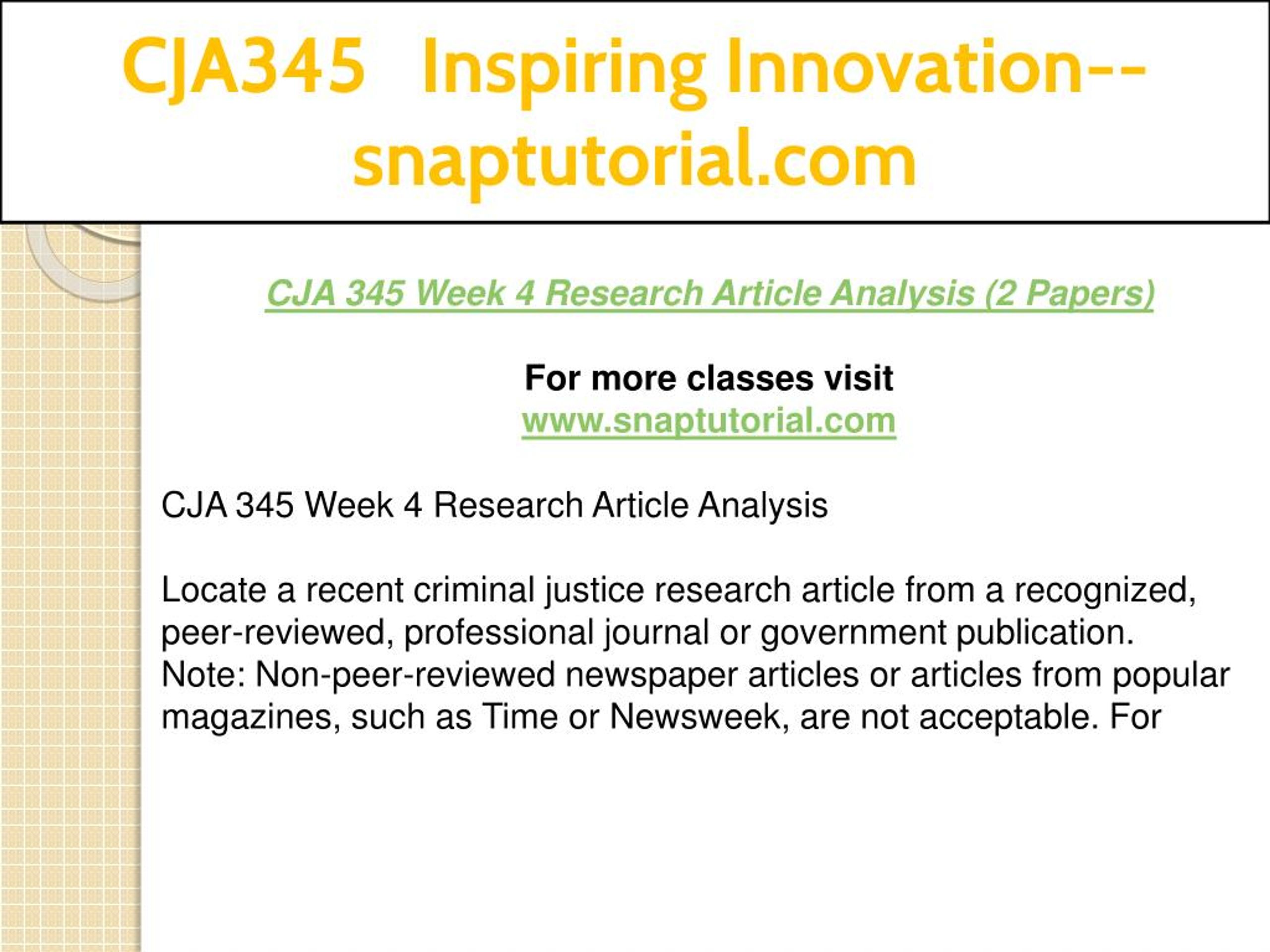 CJA345 Inspiring Innovation--snaptutorial.com CJA 345 Week 4 Research Article Analysis (2 Papers) For more classes visit www.snaptutorial.com CJA 345 Week 4 Research Article Analysis Locate a recent criminal justice research article from a recognized, peer-reviewed, professional journal or government publication. Note: Non-peer-reviewed newspaper articles or articles from popular magazines, such as Time or Newsweek, are not acceptable. For