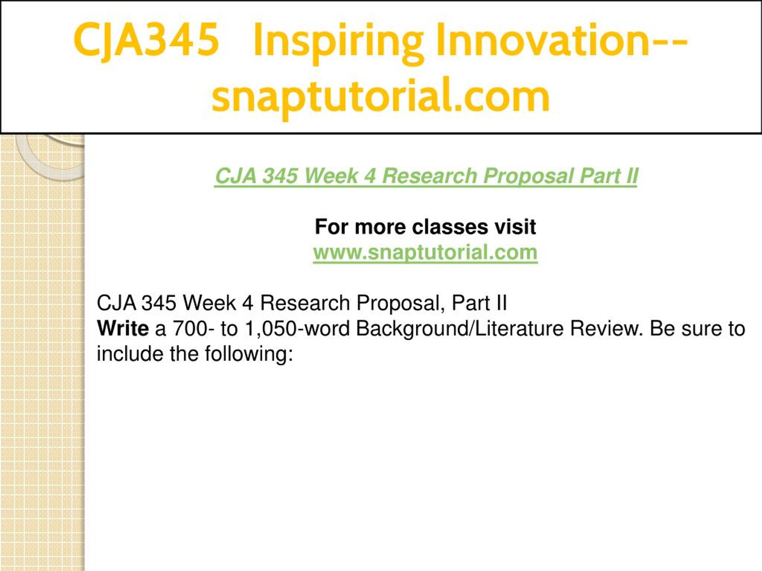 CJA345 Inspiring Innovation--snaptutorial.com CJA 345 Week 4 Research Proposal Part II For more classes visit www.snaptutorial.com CJA 345 Week 4 Research Proposal, Part II Write a 700- to 1,050-word Background/Literature Review. Be sure to include the following:
