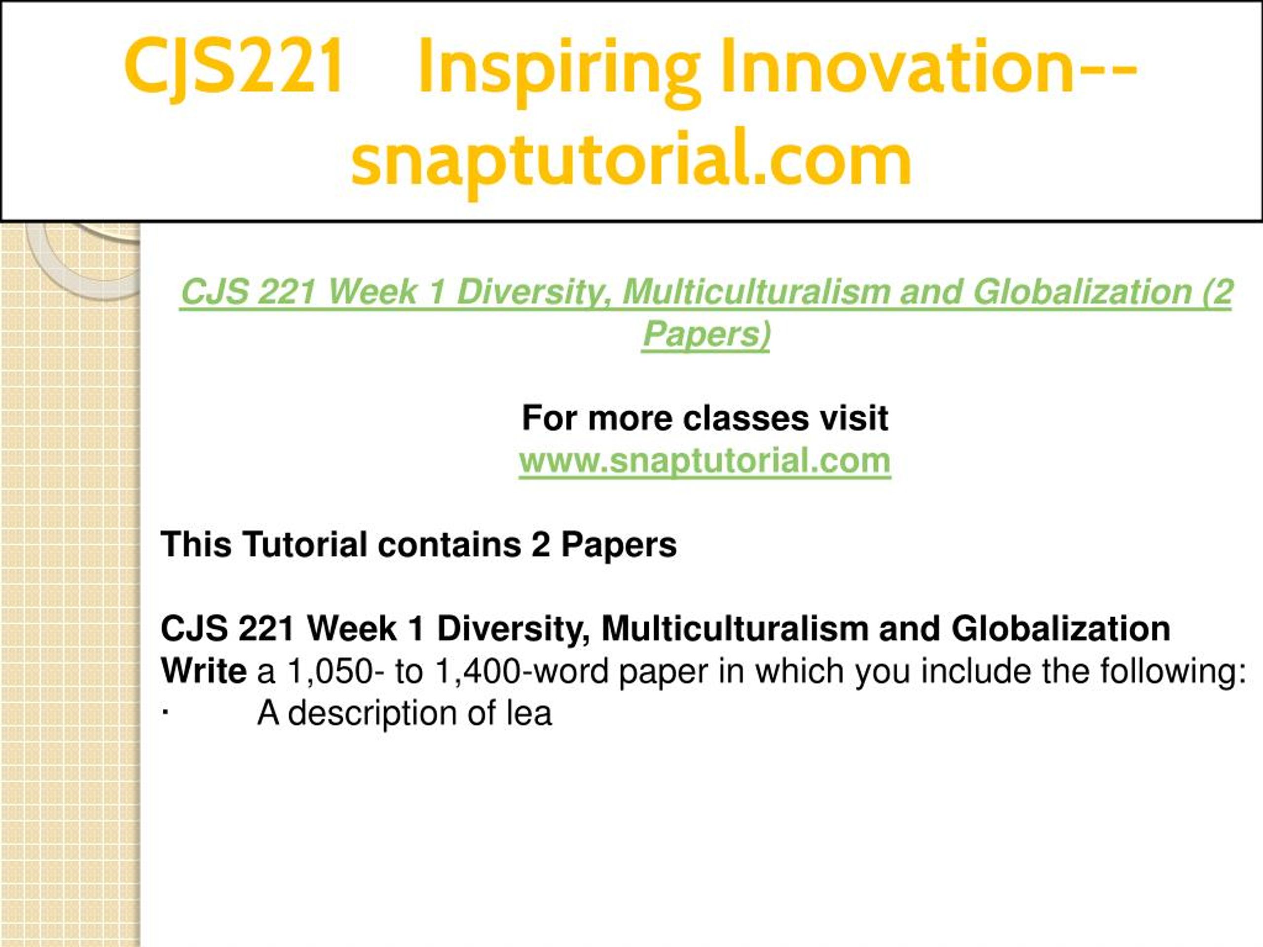 CJS221 Inspiring Innovation--snaptutorial.com CJS 221 All Assignments For more classes visit www.snaptutorial.com CJS 221 Week 1 Diversity, Multiculturalism and Globalization (2 Papers)