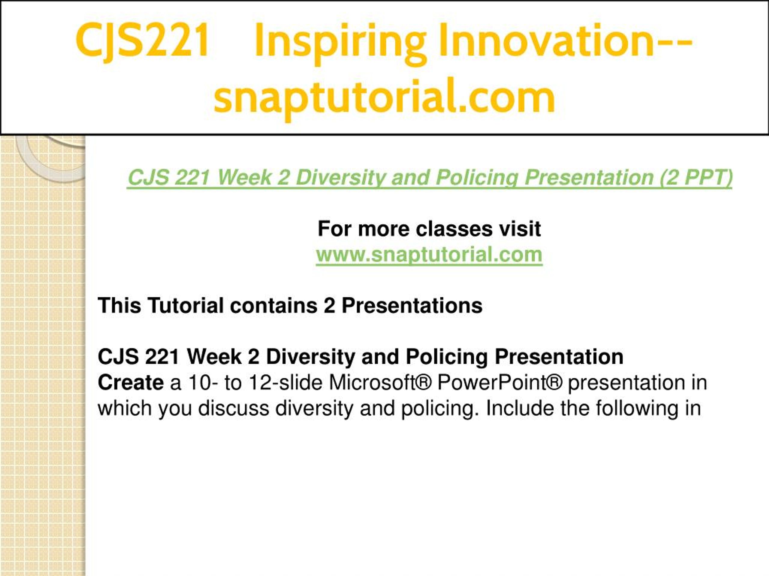 CJS221 Inspiring Innovation--snaptutorial.com CJS 221 Week 2 Diversity and Policing Presentation (2 PPT) For more classes visit www.snaptutorial.com This Tutorial contains 2 Presentations CJS 221 Week 2 Diversity and Policing Presentation Create a 10- to 12-slide Microsoft® PowerPoint® presentation in which you discuss diversity and policing. Include the following in