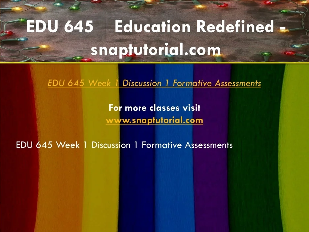 EDU 645 Education Redefined - snaptutorial.com EDU 645 Week 1 Discussion 1 Formative Assessments For more classes visit www.snaptutorial.com EDU 645 Week 1 Discussion 1 Formative Assessments