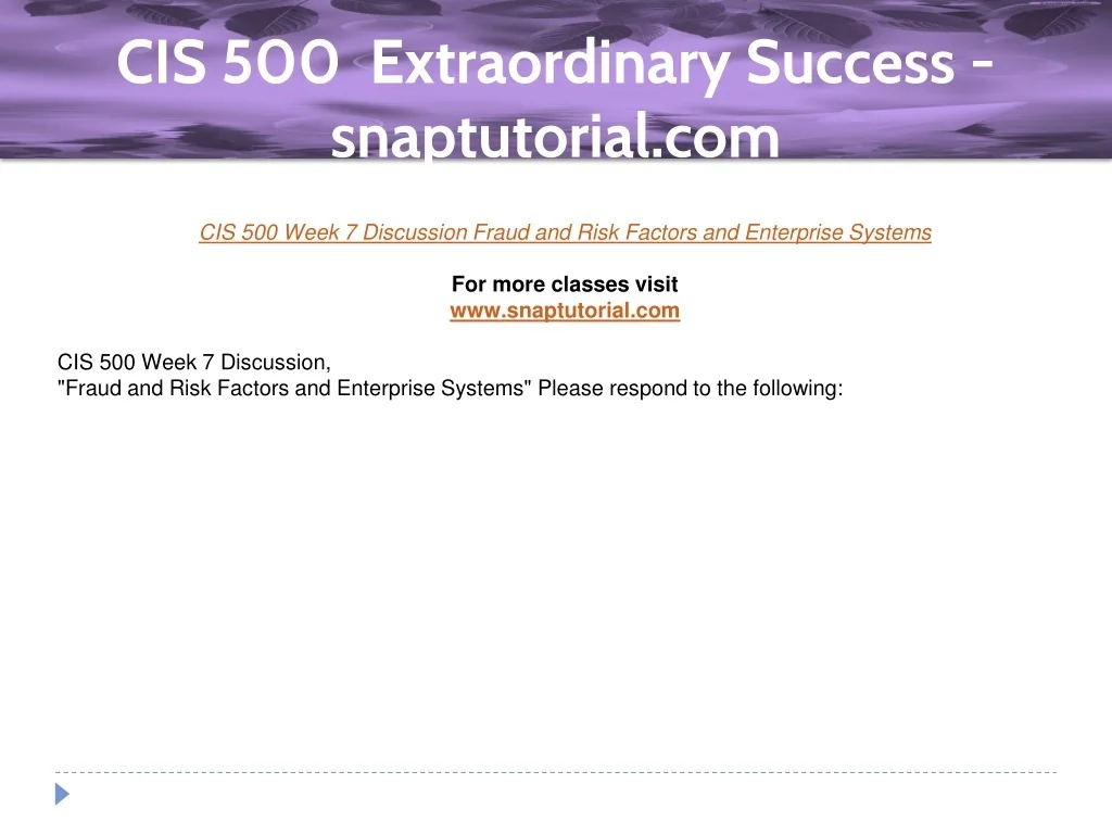 CIS 500 Extraordinary Success - snaptutorial.com CIS 500 Week 7 Discussion Fraud and Risk Factors and Enterprise Systems For more classes visit www.snaptutorial.com CIS 500 Week 7 Discussion, "Fraud and Risk Factors and Enterprise Systems" Please respond to the following: