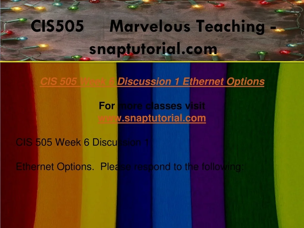 CIS505 Marvelous Teaching - snaptutorial.com CIS 505 Week 6 Discussion 1 Ethernet Options For more classes visit www.snaptutorial.com CIS 505 Week 6 Discussion 1 Ethernet Options. Please respond to the following: