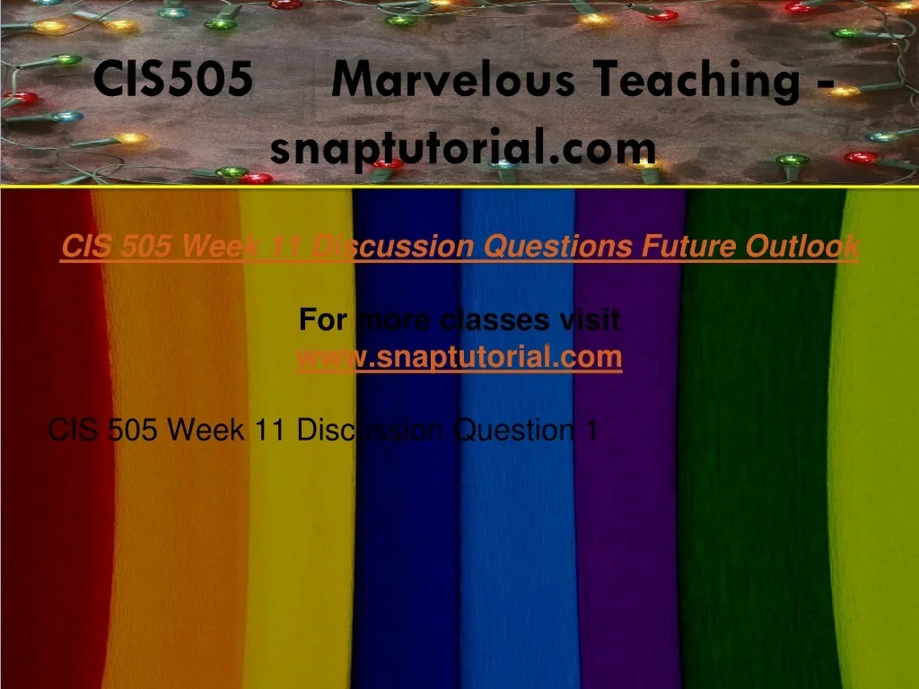 CIS505 Marvelous Teaching - snaptutorial.com CIS 505 Week 11 Discussion Questions Future Outlook For more classes visit www.snaptutorial.com CIS 505 Week 11 Discussion Question 1