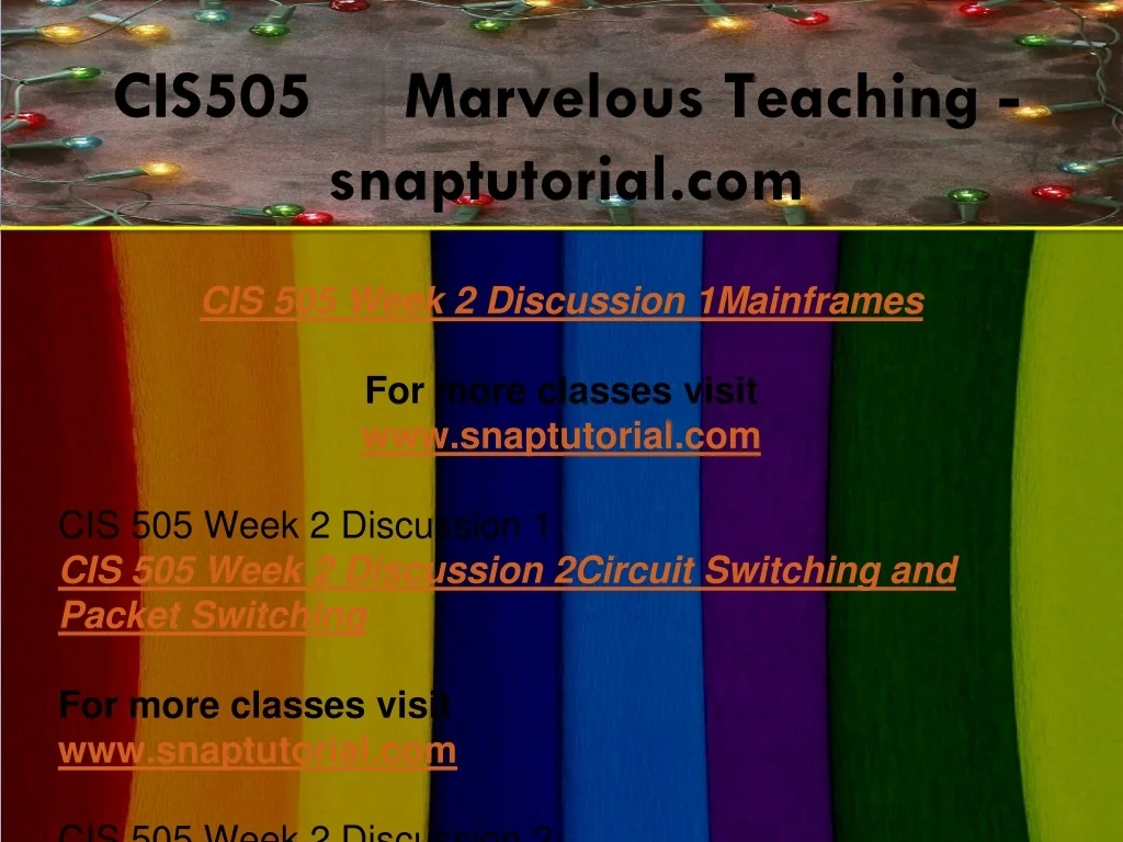 CIS505 Marvelous Teaching - snaptutorial.com CIS 505 Week 2 Discussion 1Mainframes For more classes visit www.snaptutorial.com CIS 505 Week 2 Discussion 1 CIS 505 Week 2 Discussion 2Circuit Switching and Packet Switching For more classes visit www.snaptutorial.com CIS 505 Week 2 Discussion 2