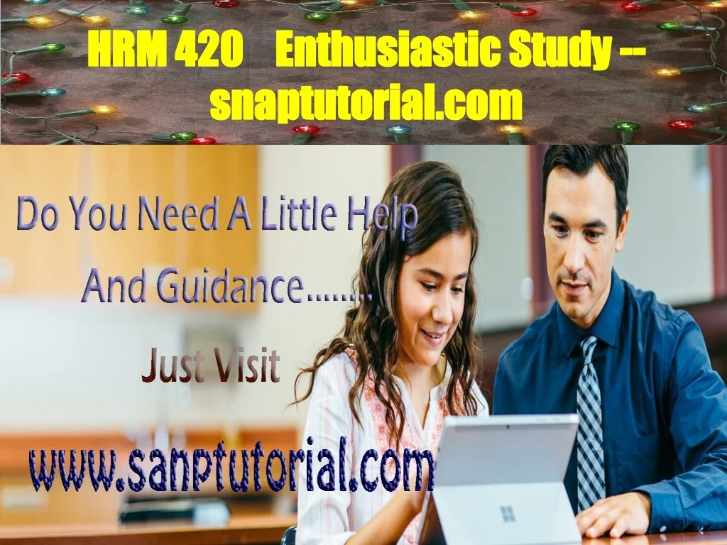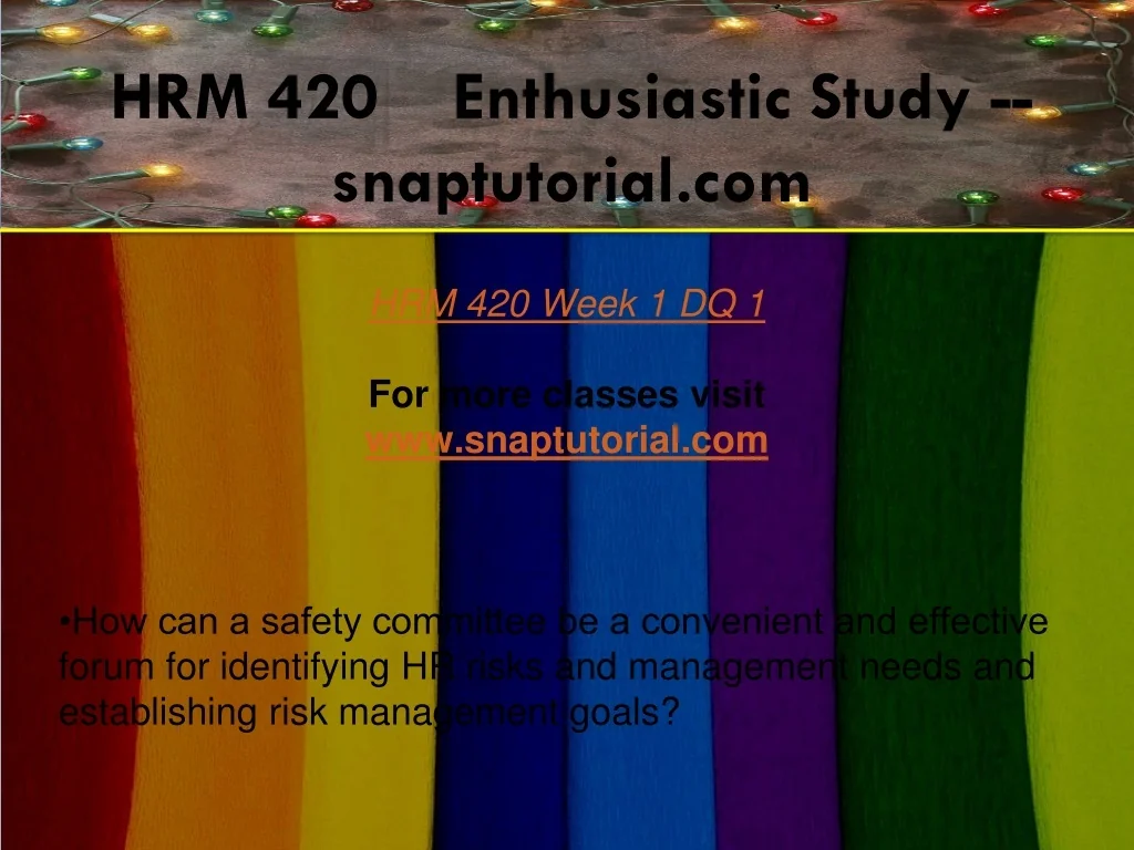 HRM 420 Enthusiastic Study -- snaptutorial.com HRM 420 Entire Course For more classes visit www.snaptutorial.com HRM 420 Week 1 Individual Assignment Paper Human Resource Risk Seminars (Appendix A) HRM 420 Week 1 DQ 1