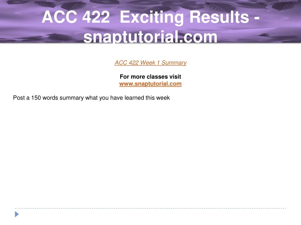 ACC 422 Exciting Results - snaptutorial.com ACC 422 Week 1 Summary For more classes visit www.snaptutorial.com Post a 150 words summary what you have learned this week