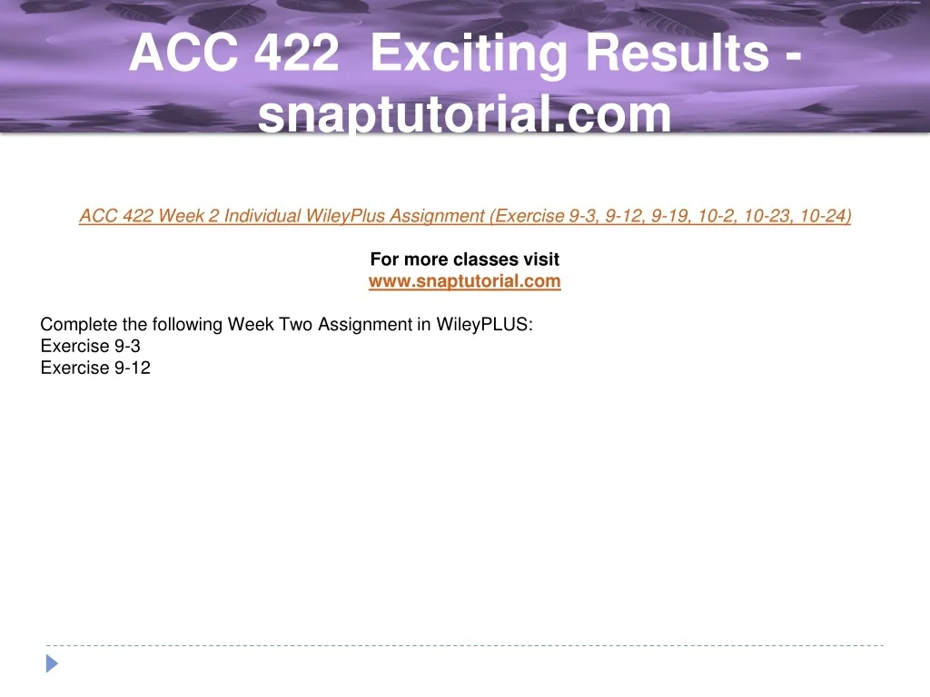 ACC 422 Exciting Results - snaptutorial.com ACC 422 Final Exam Guide (New 2019, With EXCEL FILE, Score 29/30) For more classes visit www.snaptutorial.com This Tutorial contains excel File which can be used to solve for any change in values