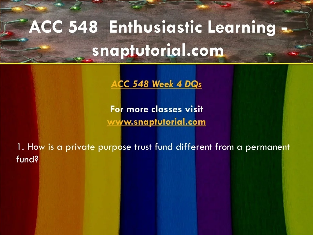 ACC 548 Enthusiastic Learning - snaptutorial.com ACC 548 Week 4 DQs For more classes visit www.snaptutorial.com 1. How is a private purpose trust fund different from a permanent fund?