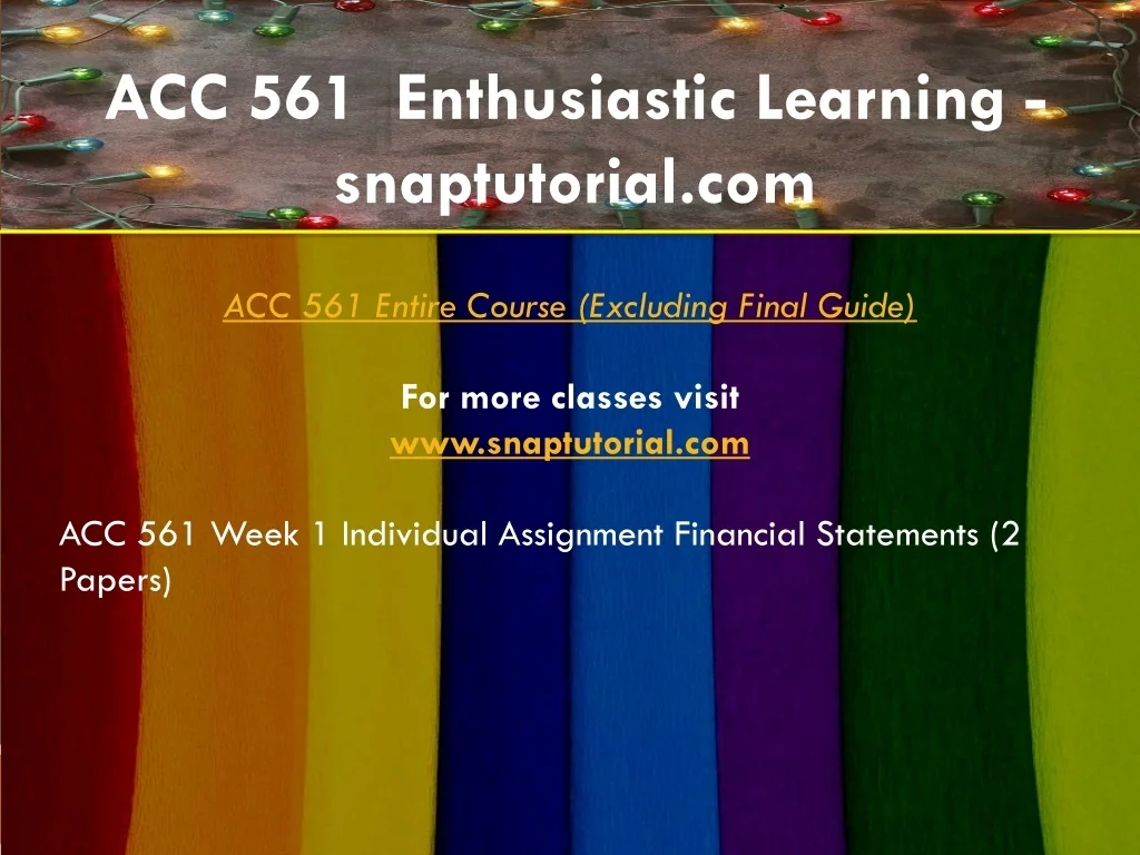 ACC 561 Enthusiastic Learning - snaptutorial.com ACC 561 Entire Course (Excluding Final Guide) For more classes visit www.snaptutorial.com ACC 561 Week 1 Individual Assignment Financial Statements (2 Papers)