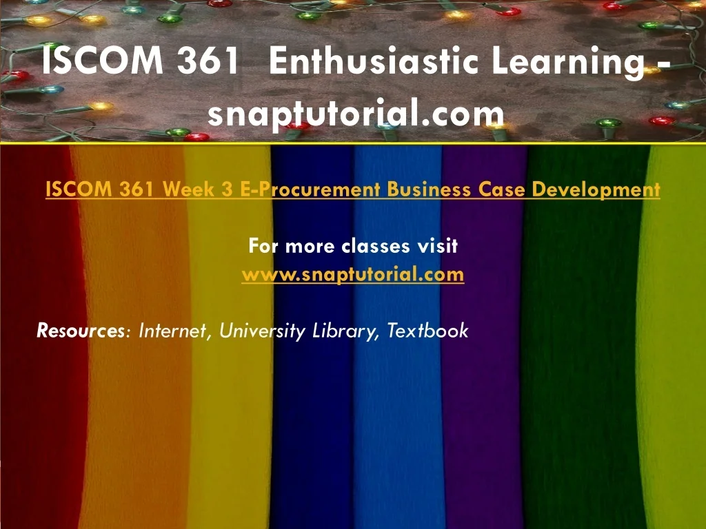 ISCOM 361 Enthusiastic Learning - snaptutorial.com ISCOM 361 Week 3 E-Procurement Business Case Development For more classes visit www.snaptutorial.com Resources: Internet, University Library, Textbook