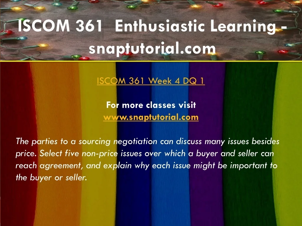 ISCOM 361 Enthusiastic Learning - snaptutorial.com ISCOM 361 Week 4 DQ 1 For more classes visit www.snaptutorial.com The parties to a sourcing negotiation can discuss many issues besides price. Select five non-price issues over which a buyer and seller can reach agreement, and explain why each issue might be important to the buyer or seller.