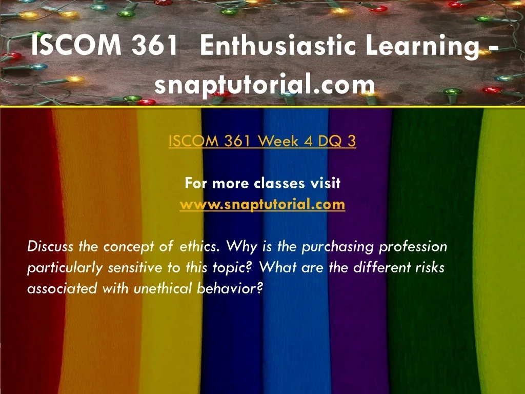 ISCOM 361 Enthusiastic Learning - snaptutorial.com ISCOM 361 Week 4 DQ 3 For more classes visit www.snaptutorial.com Discuss the concept of ethics. Why is the purchasing profession particularly sensitive to this topic? What are the different risks associated with unethical behavior?