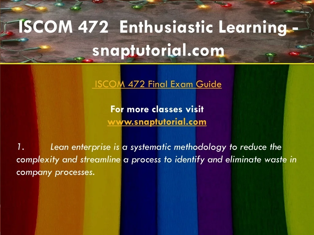 ISCOM 472 Enthusiastic Learning - snaptutorial.com ISCOM 472 Final Exam Guide For more classes visit www.snaptutorial.com 1. Lean enterprise is a systematic methodology to reduce the complexity and streamline a process to identify and eliminate waste in company processes.