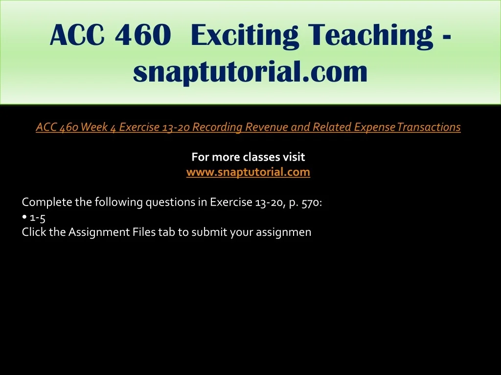 ACC 460 Exciting Teaching - snaptutorial.com ACC 460 Week 5 Team Key Concept Presentation For more classes visit www.snaptutorial.com Create a slide presentation of 10 to 12 slides. Address the following: