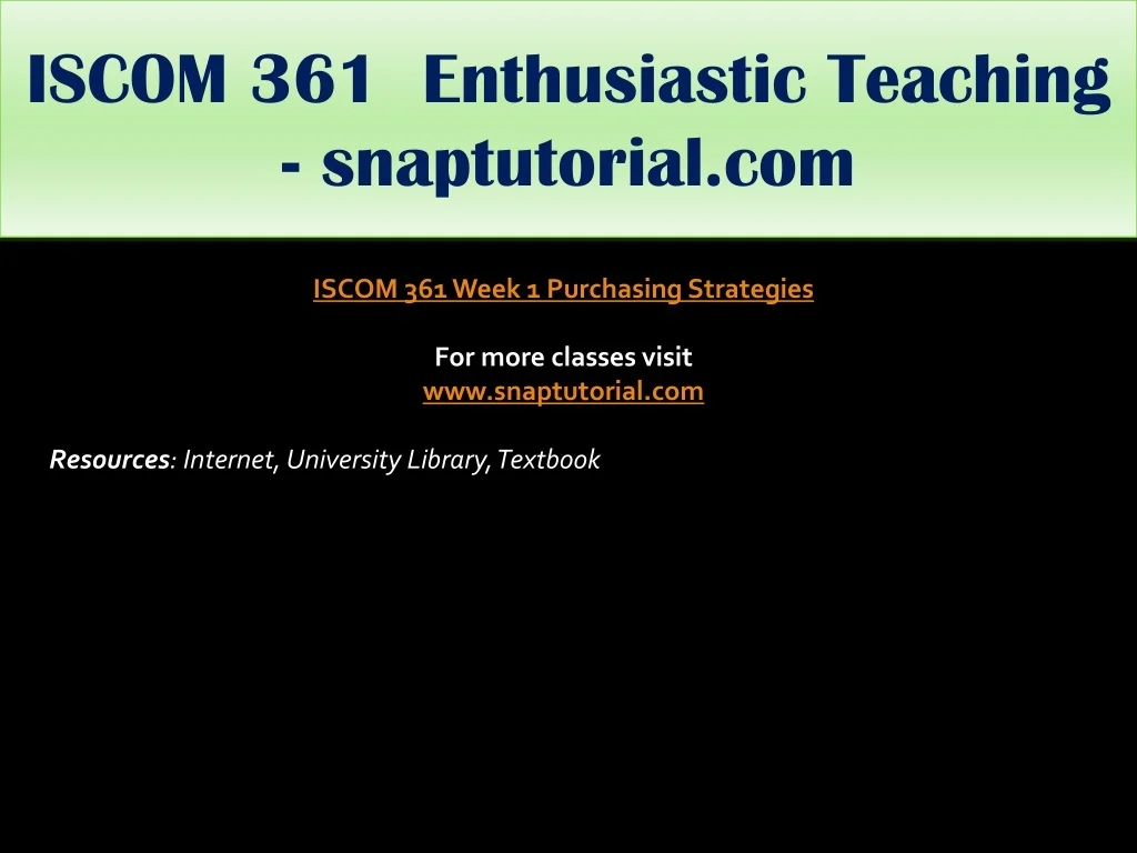 ISCOM 361 Enthusiastic Teaching - snaptutorial.com ISCOM 361 Week 1 Purchasing Strategies For more classes visit www.snaptutorial.com Resources: Internet, University Library, Textbook