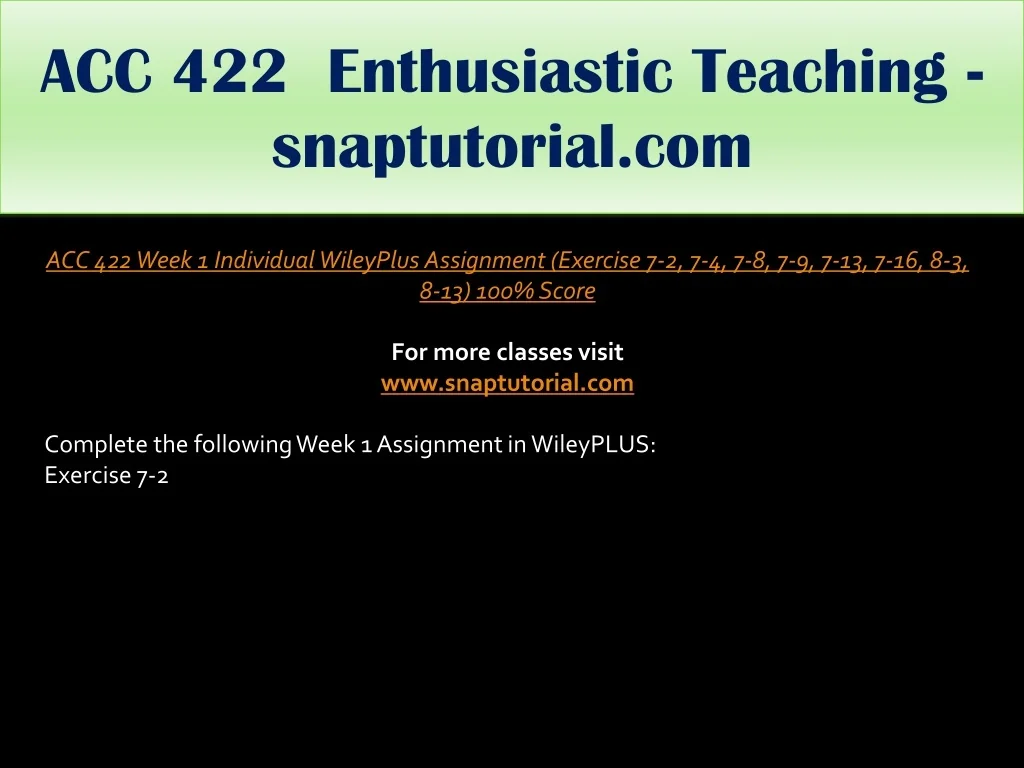 ACC 422 Enthusiastic Teaching - snaptutorial.com ACC 422 Week 1 Individual WileyPlus Assignment (Exercise 7-2, 7-4, 7-8, 7-9, 7-13, 7-16, 8-3, 8-13) 100% Score For more classes visit www.snaptutorial.com Complete the following Week 1 Assignment in WileyPLUS: Exercise 7-2