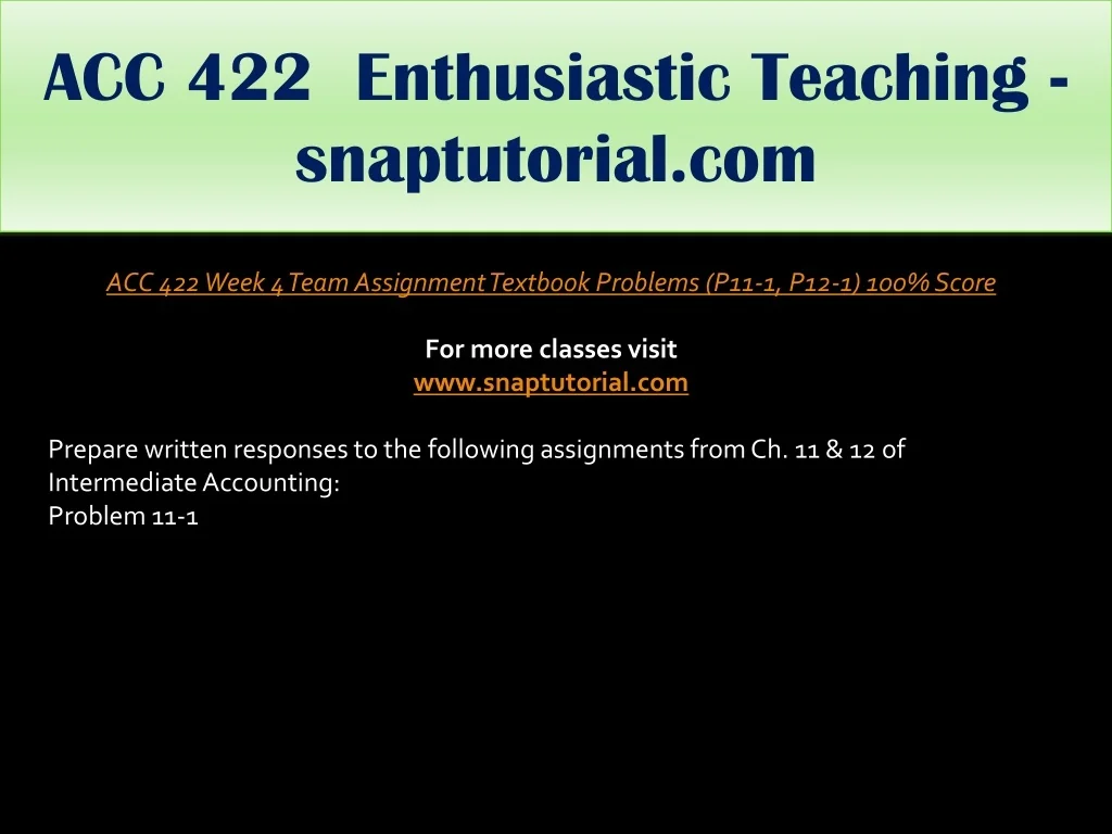 ACC 422 Enthusiastic Teaching - snaptutorial.com ACC 422 Week 4 Team Assignment Textbook Problems (P11-1, P12-1) 100% Score For more classes visit www.snaptutorial.com Prepare written responses to the following assignments from Ch. 11 & 12 of Intermediate Accounting: Problem 11-1