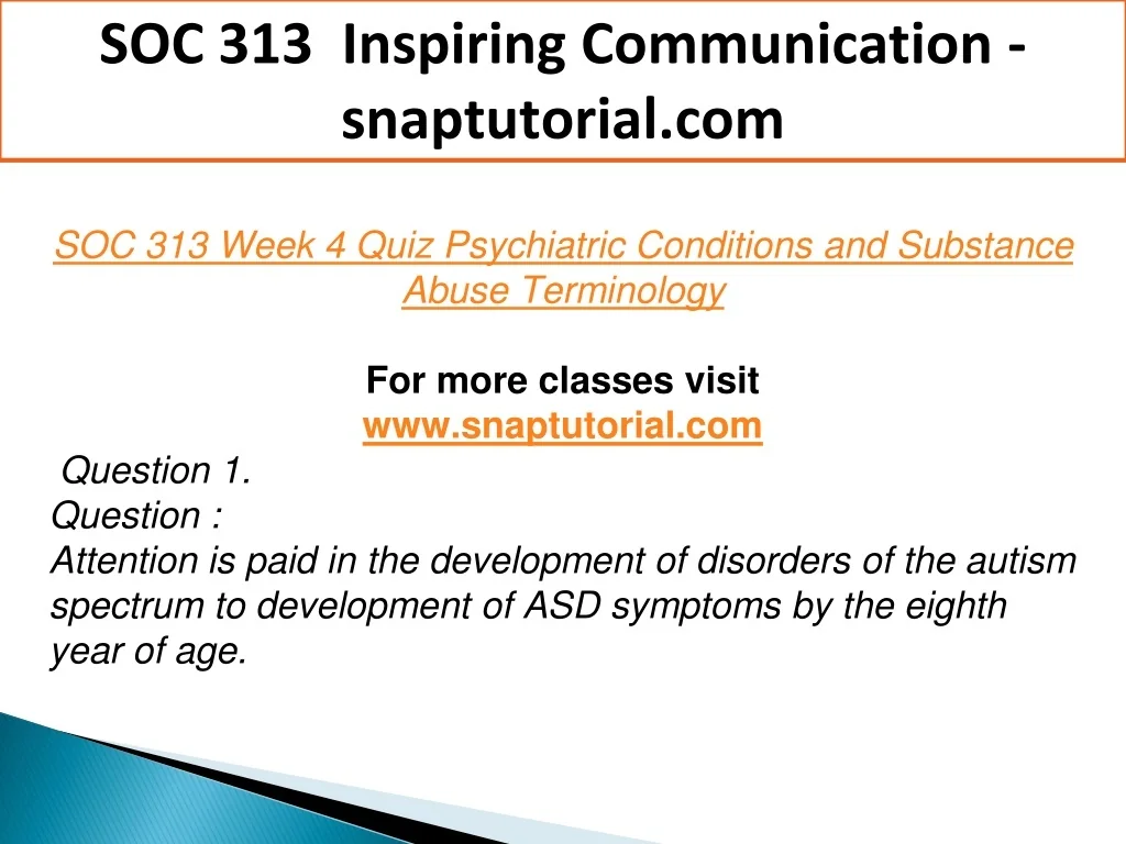 SOC 313 Inspiring Communication - snaptutorial.com SOC 313 Week 4 Quiz Psychiatric Conditions and Substance Abuse Terminology For more classes visit www.snaptutorial.com Question 1. Question : Attention is paid in the development of disorders of the autism spectrum to development of ASD symptoms by the eighth year of age.