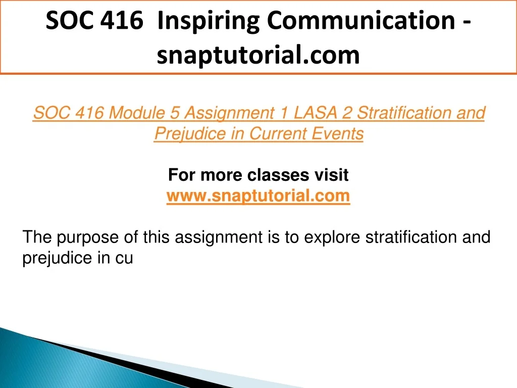 SOC 416 Inspiring Communication - snaptutorial.com SOC 416 Module 5 Assignment 1 LASA 2 Stratification and Prejudice in Current Events For more classes visit www.snaptutorial.com The purpose of this assignment is to explore stratification and prejudice in cu